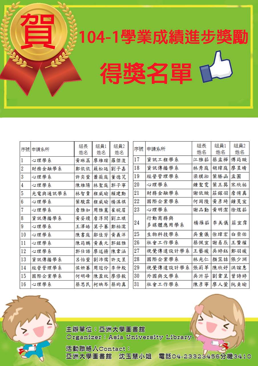 104-1學業成績進步獎勵得獎名單公告!恭喜93位同學榮獲獎狀乙只及現金1,000元!