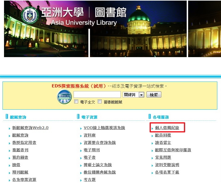 STEP 1. 進入圖書館網頁,點選「個人借閱現記錄」,如下圖: