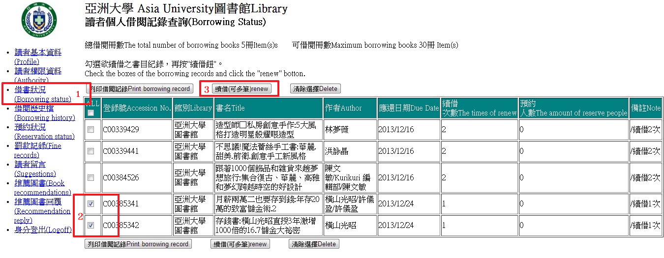 STEP 3. 點選「借書狀況」,在要續借的圖書登錄號前打勾,點選「續借」。