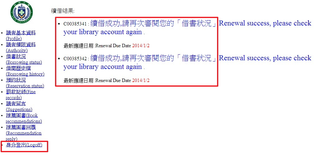 STEP 4. 續借後出現此畫面才表示續借成功,且會顯示最新應還日期,若無,請於上班時間電洽圖書館服務櫃台3415辦理。