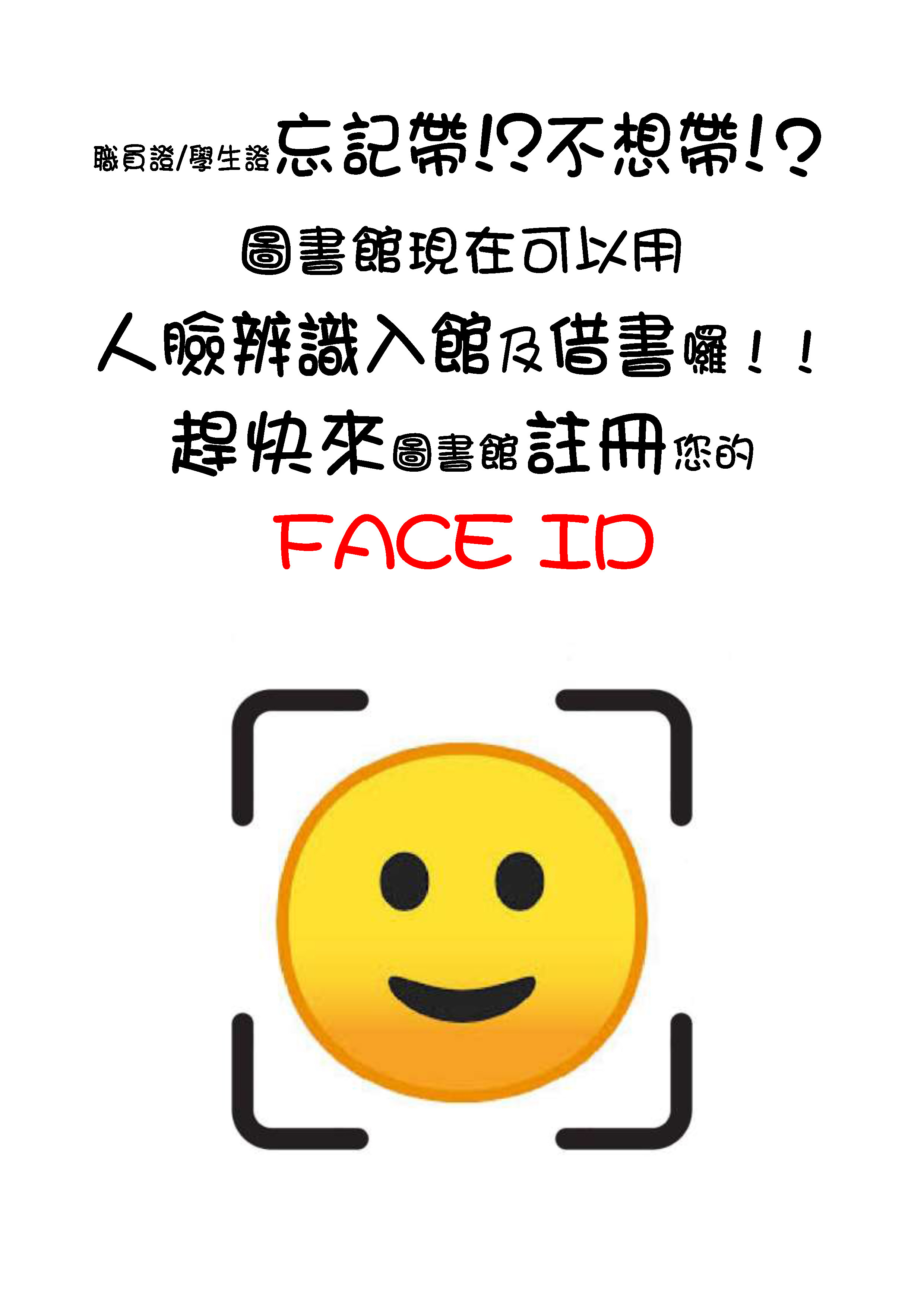 【公告】人臉辨識系統開放註冊,借書期限延長至3/8,歡迎全校師生多加利用! 2019-01-07 圖書館人臉辨識系統開放註冊囉~ 到圖書館櫃台註冊您的FACE ID, 就可以人臉辨識來進出圖書館和借書, 現在借書期限配合寒假,延長到3/8, 歡迎大家多加利用!!