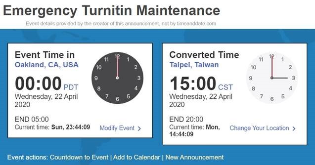 【公告】Turnitin臨時緊急通知將於2020/04/22(週三)15:00~20:00進行系統維護, 在此期間,用戶將可能無法登入或是無法產生報告,若造成使用者不便之處,敬請見諒。 2020-04-22