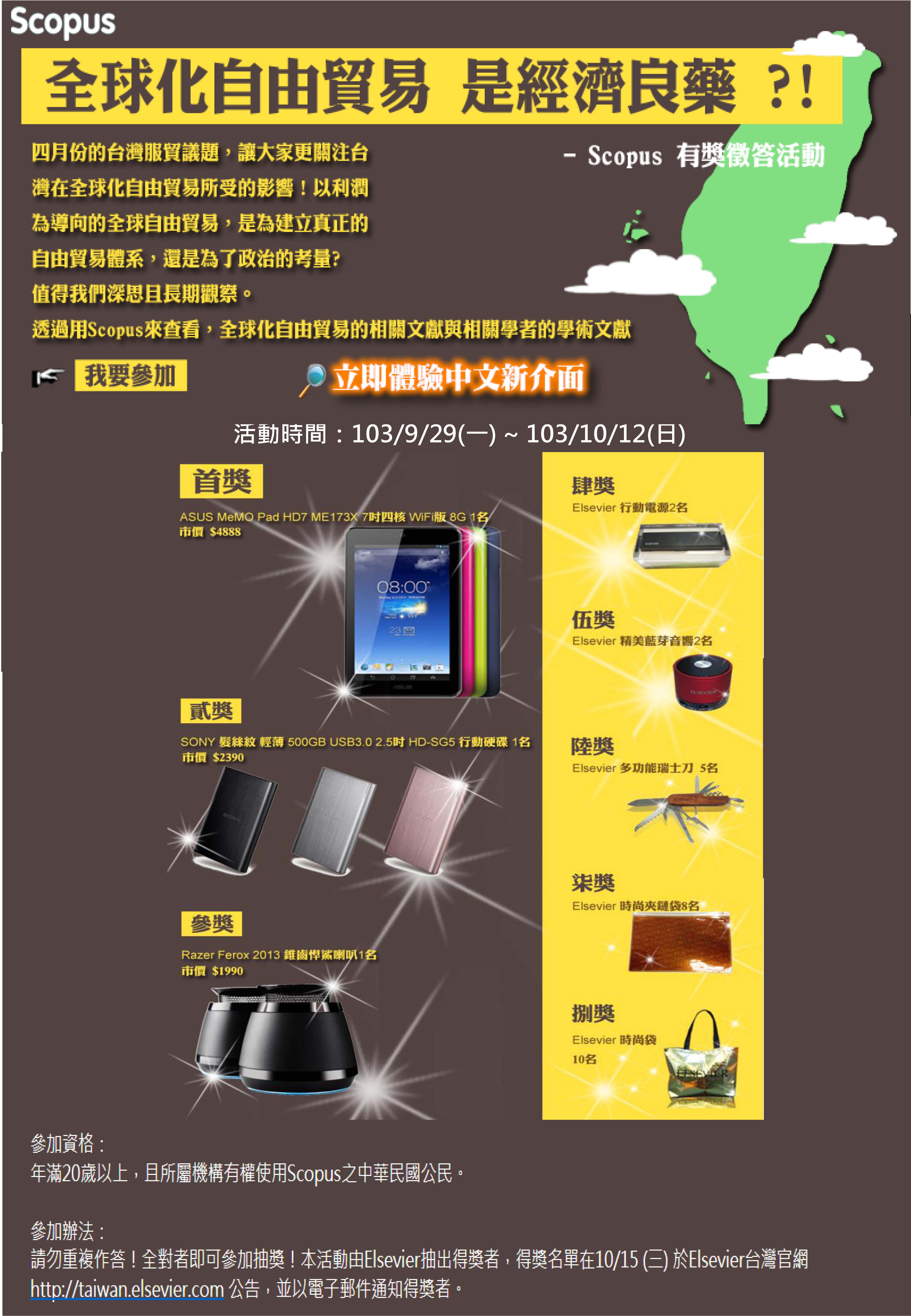 Scopus(www.scopus.com)為全球最大的索引摘要資料庫,由全球超過500位使用者以及圖書管理人員所共同設計發展而成,提供了協助研究追蹤分析與視覺化的智慧工具。來自全球5,000個出版公司,收錄21,915種文獻 [201405],主要為同儕審查期刊,會議論文、叢書、商業期刊,確保其廣泛的跨領域性。