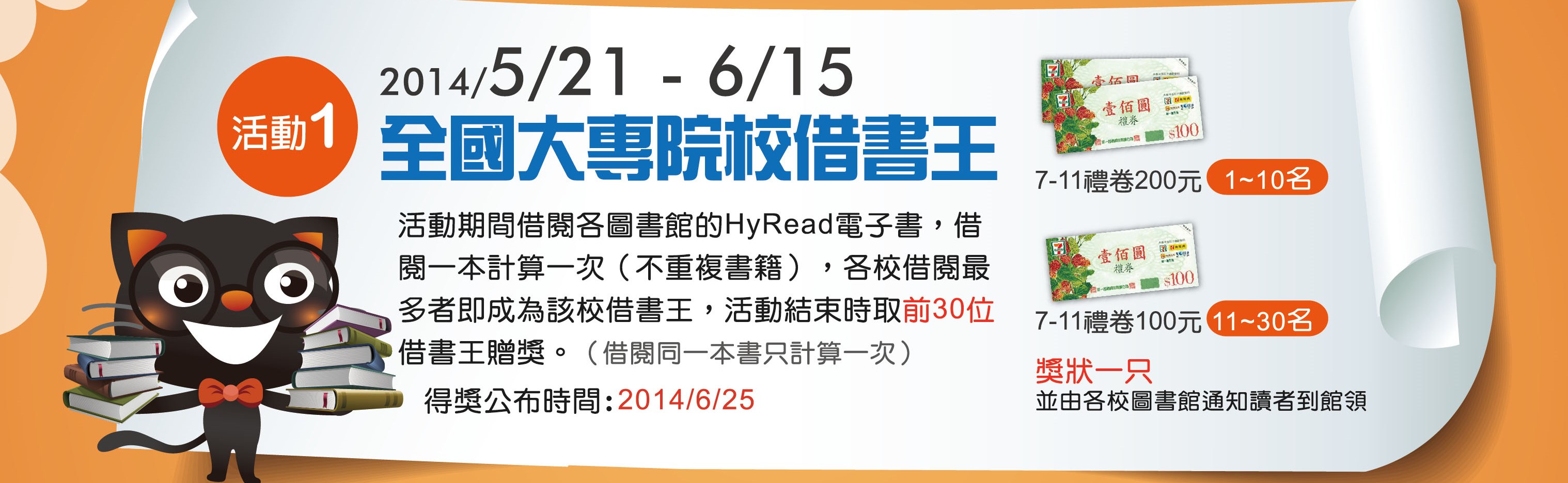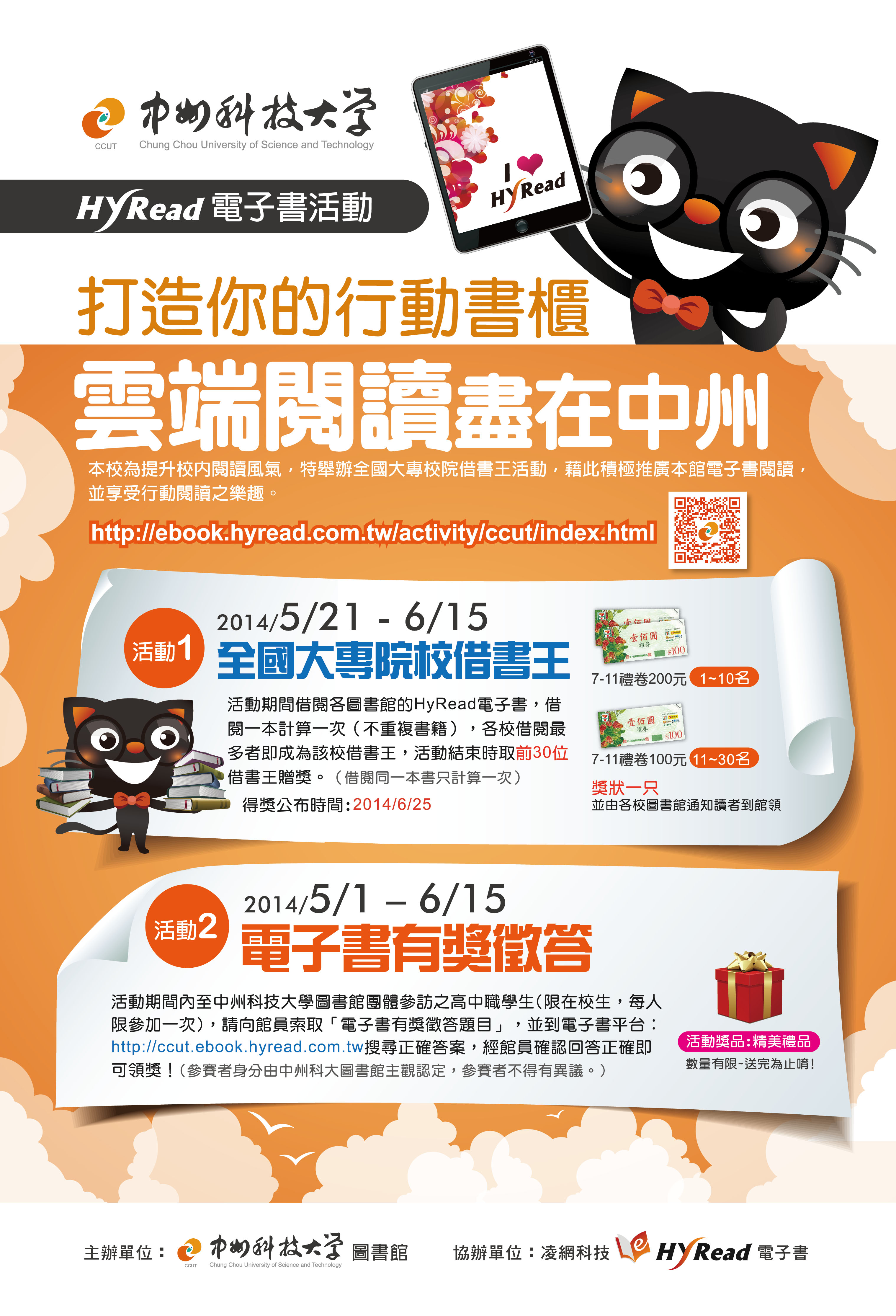 活動內容:活動期間內借閱各圖書館的HyRead電子書,借閱一本計算一次(不重複書籍),各校借閱最多者即成為該校借書王,活動結束時取前30位借書王贈獎。