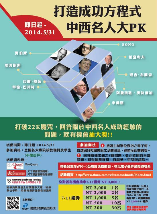 漢珍數位圖書進行《打造成功方程式 中西名人大PK》有獎徵答活動。