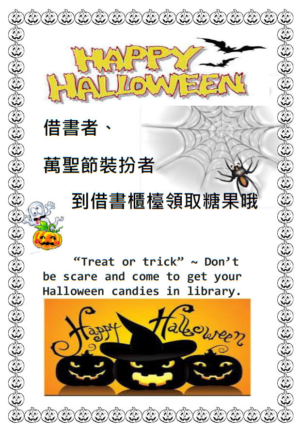 來借書!不搗蛋!就給糖!即日起-11/01止,有借書或萬聖節裝扮者,可到借書櫃檯領取糖果唷! 2014-10-27 來借書!不搗蛋!就給糖!即日起-11/01止,有借書或萬聖節裝扮者,可到借書櫃檯領取糖果唷!