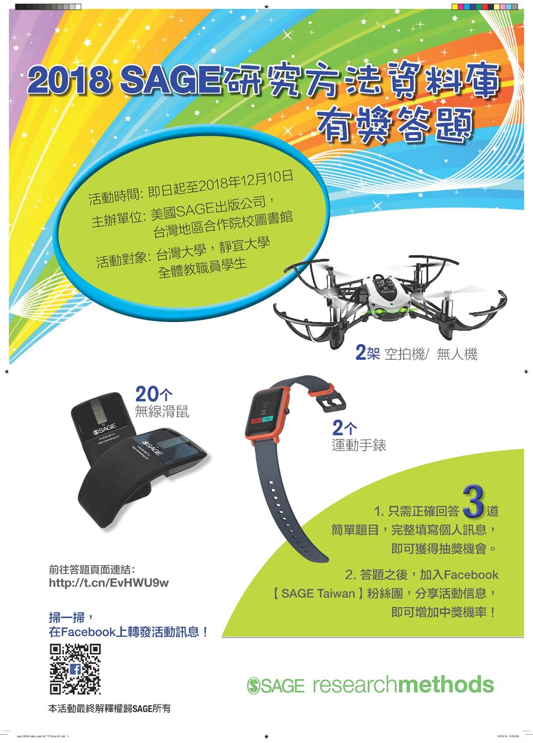 即日起至12/10止,參加「2018 SAGE研究方法資料庫有獎答題」,有機會抽空拍機/無人機喔! 2018-11-03 即日起至12/10止,參加「2018 SAGE研究方法資料庫有獎答題」,有機會抽空拍機/無人機喔!