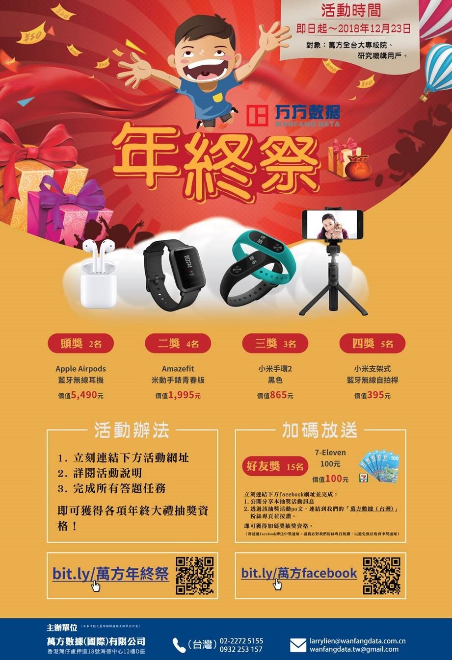 即日起至12/23止,參加「萬方年終祭」《萬方數據知識服務平台》線上有獎徵答活動,極簡單填答抽好獎喔!