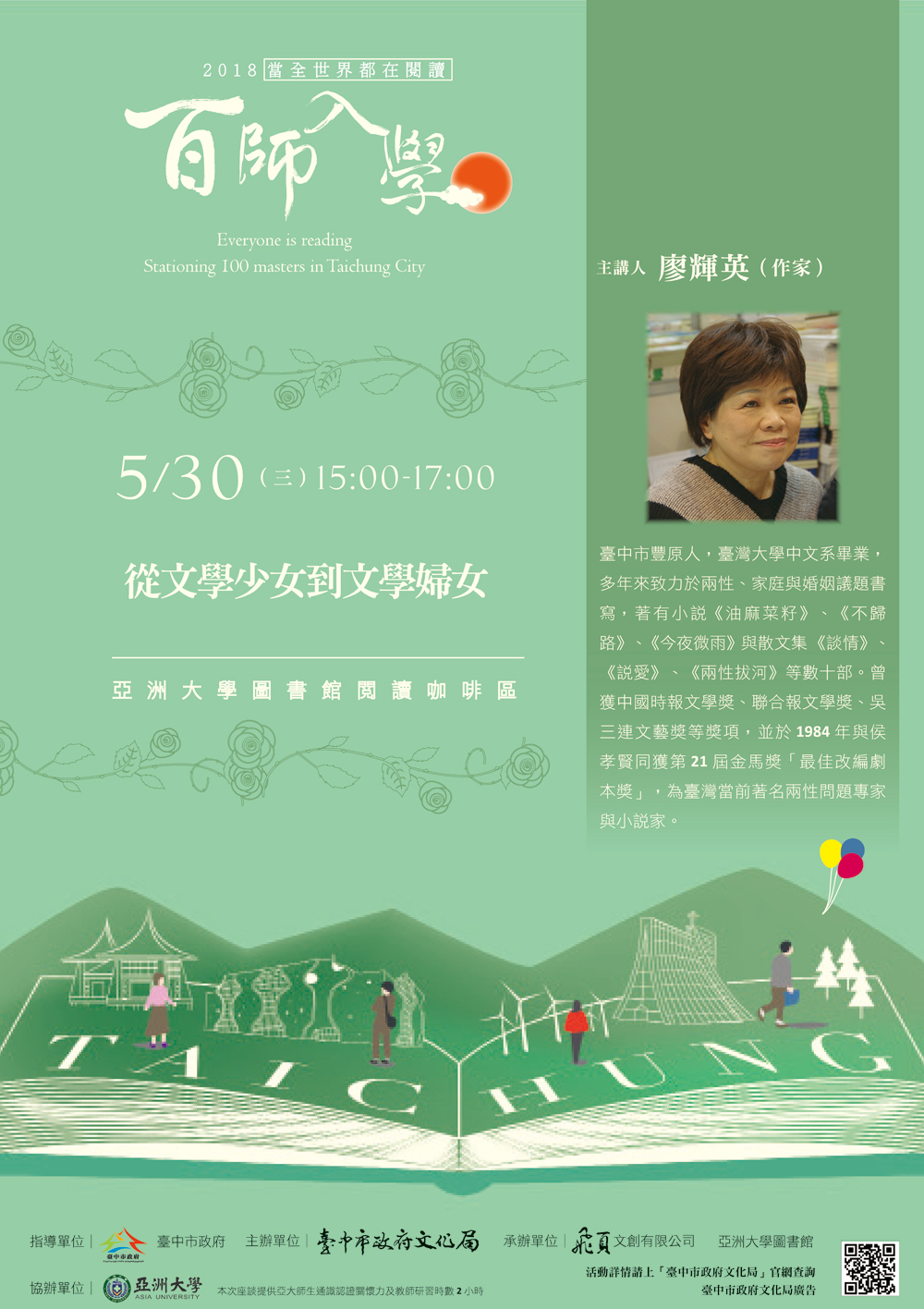 圖書館演講公告:107/05/30(三) 15:00-17:00台中市文化局2018當全世界都在閱讀-「百師入學」講座,主講人:知名暢銷作家廖輝英老師,講題:從文學少女到文學婦女,歡迎踴躍報名! 2018-05-28 圖書館演講公告:107/05/30(三) 15:00-17:00台中市文化局2018當全世界都在閱讀-「百師入學」講座,主講人:知名暢銷作家廖輝英老師,講題:從文學少女到文學婦女,歡迎踴躍報名 【報名網址】