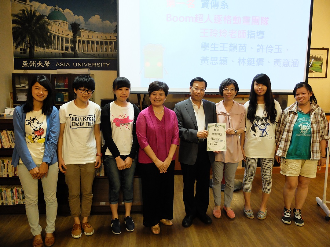 獲得第一名的「Boom超人逐格動畫團隊」由王韻茵、許伶玉、黃思穎、林鋌僑、黃意涵等同學組成、資傳系王玲玲老師指導,王韻茵同學表示,這次是製作逐格動畫影片,行銷亞大資傳系特色,大家發揮團隊合作精神,並能將影片成果利用不同管道宣傳,展現高度創意與專業。