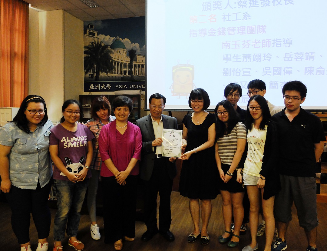 亞洲大學(Asia University, Taiwan)圖書館6月19日在閱讀咖啡區舉辦「2014年度讀書會/學習社群成果競賽」,由亞大校長蔡進發主持頒獎,表揚前三名讀書會:資訊傳播學系「Boom超人逐格動畫團隊」、社會工作學系「指導金錢管理」讀書會及心理學系「認知行為治療讀書小組」讀書會及20名佳作;蔡校長勉勵同學們持續主動學習、協同學習、多元學習及終身學習,讓學習成為你的生活情趣。