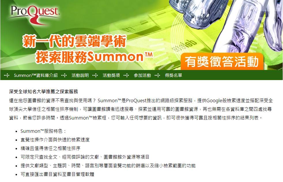 - 點選網頁上的有獎徵答區作答,請務必參考並使用Summon™完成所有問答,全對者即有機會參加抽獎。