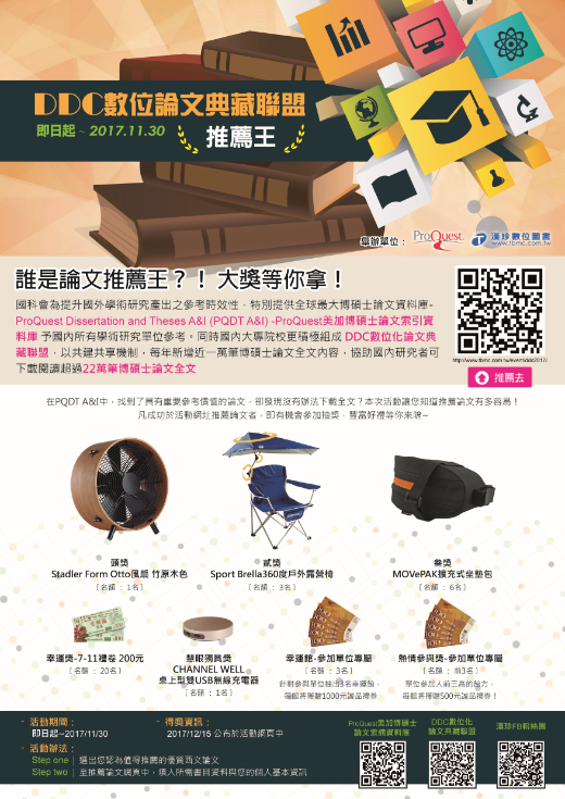 數位論文推推推!即日起至2017/11/30止,參加「誰是論文推薦王」活動, 只要實際推薦一篇論文,即可參加抽獎~ 2017-10-02 數位論文推推推!即日起至2017/11/30止,參加「誰是論文推薦王」活動, 只要實際推薦一篇論文,即可參加抽獎~