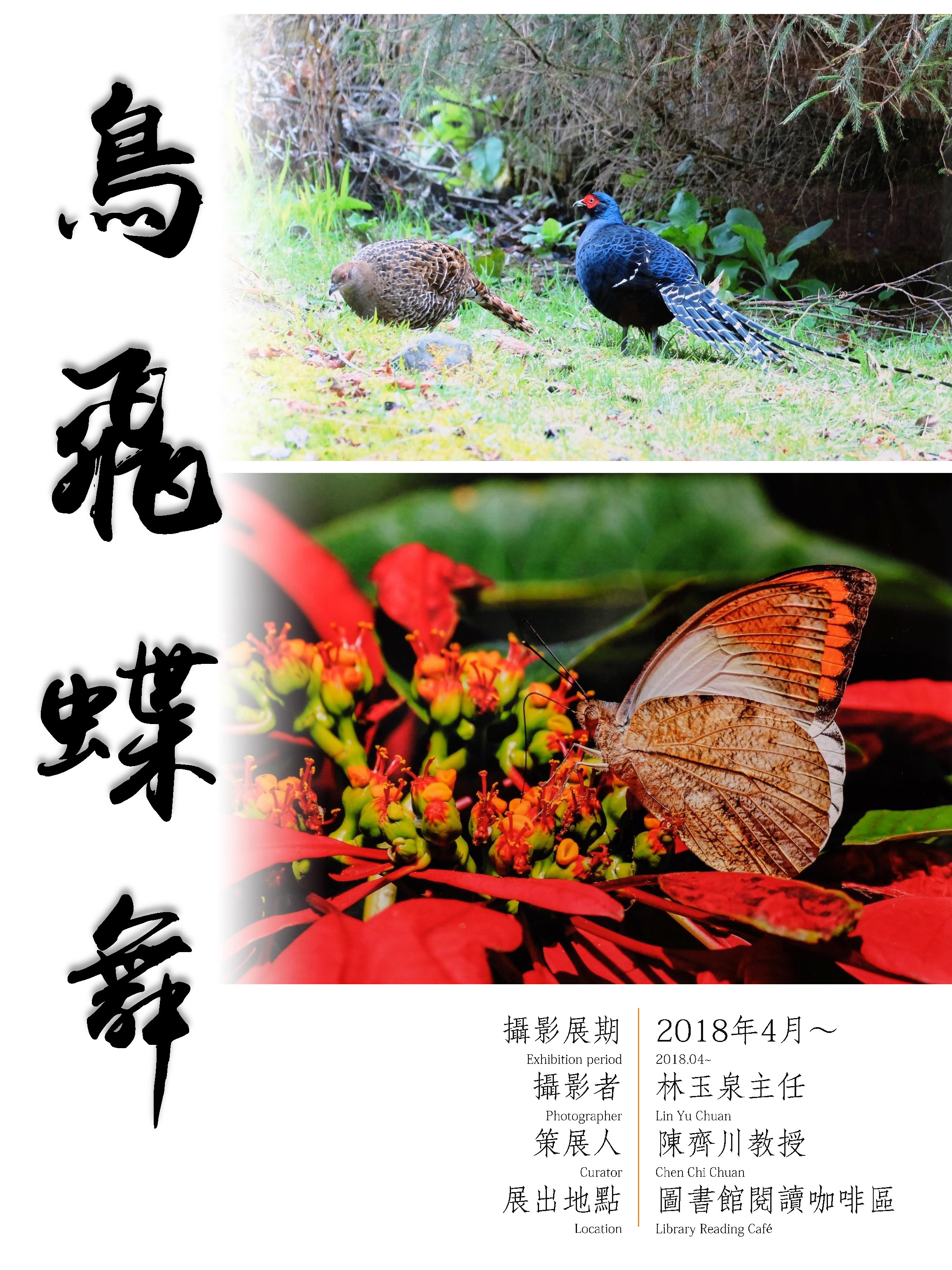 春季到、鳥飛蝶舞,林玉泉主任攝影作品《鳥飛蝶舞》於圖書館咖啡閱讀區展出中!