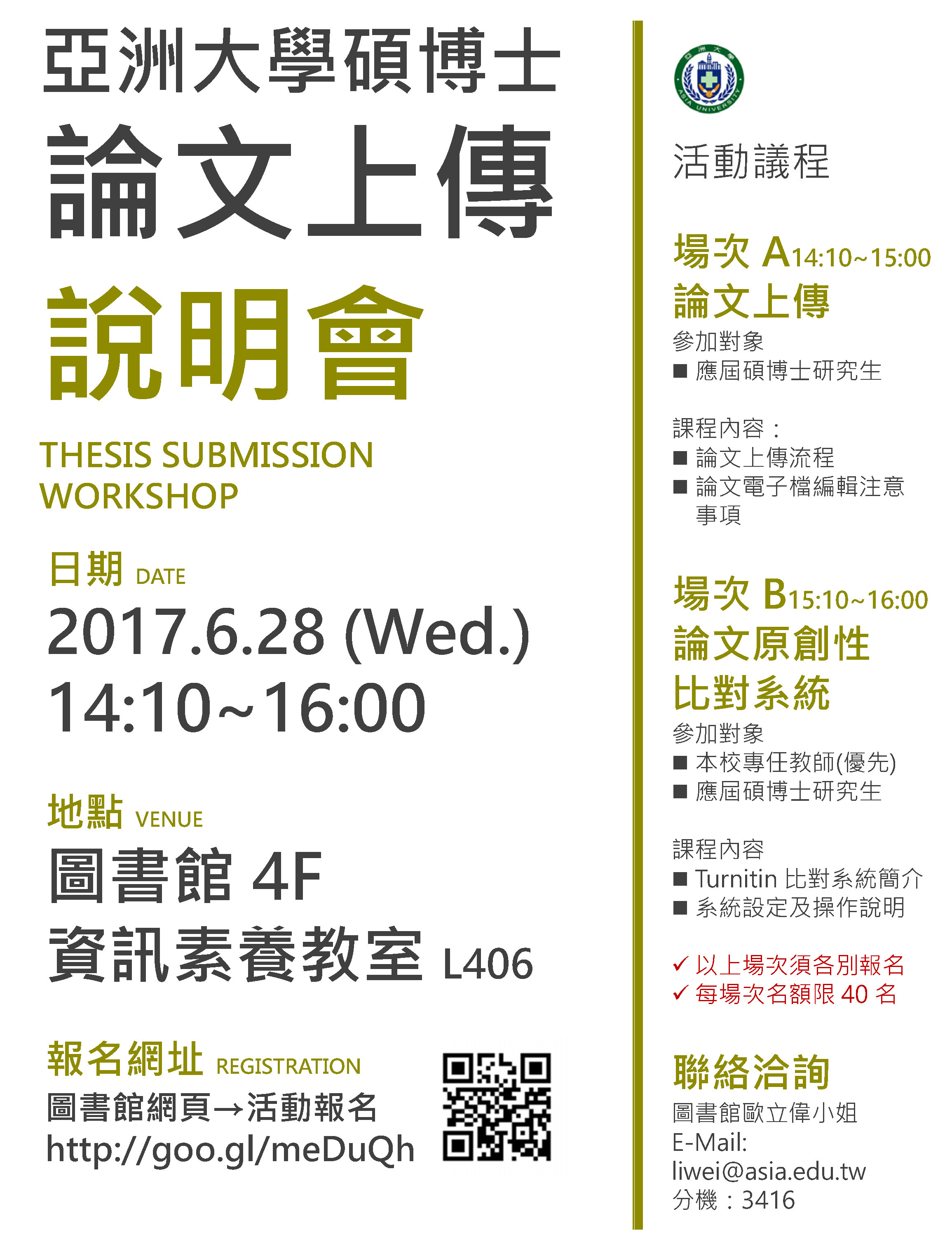 碩博士論文上傳及原創性比對系統說明會,歡迎報名參加! 2017-06-19 為能協助碩博班同學順利完成論文上傳,及指導教師進行論文比對系統操作, 圖書館於2017/6/28(週三)14:10~16:00舉辦說明會,歡迎報名參加! 報名網址:http://goo.gl/meDuQh