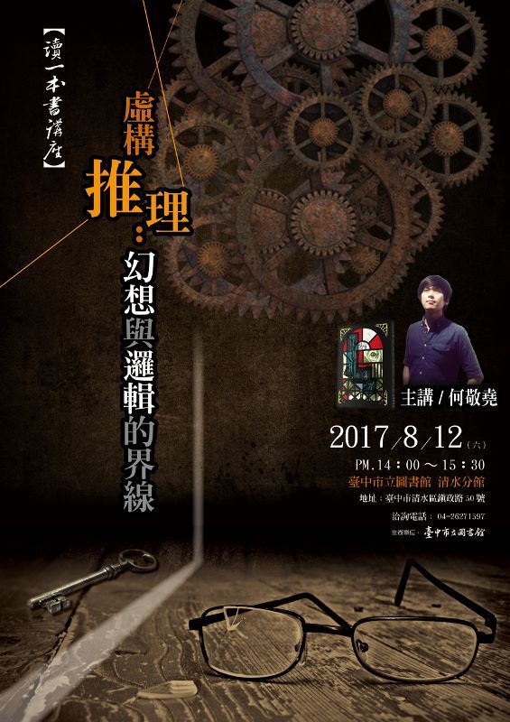 一、第一場講座邀請小說家何敬堯分享「虛構推理:幻想與邏輯的界線」,介紹關於推理小說創作的架構及寫作技巧分析,讓讀者體驗推理小說的奧妙。