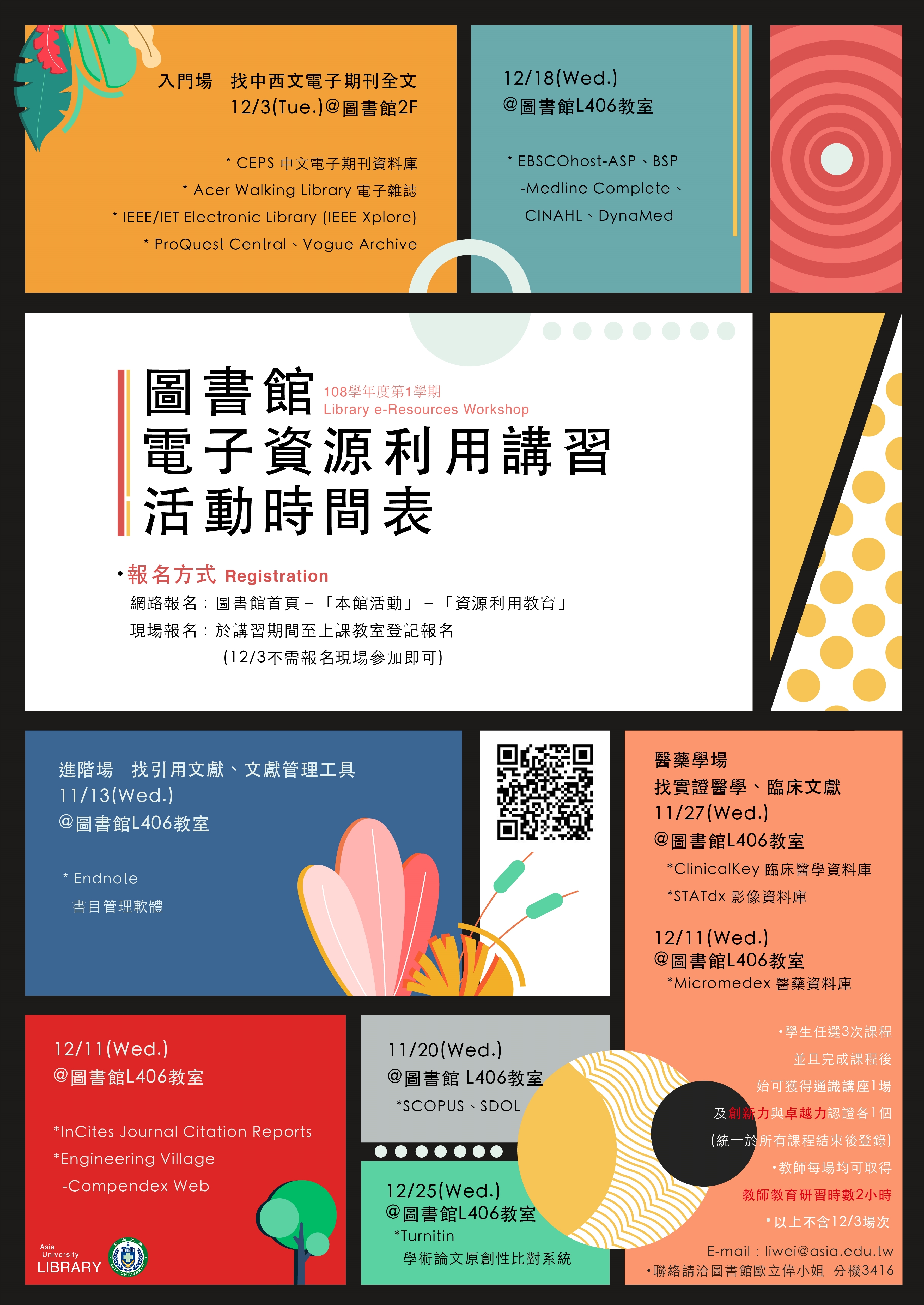 圖書館安排各種電子資源講習課程,歡迎師生踴躍報名參加!