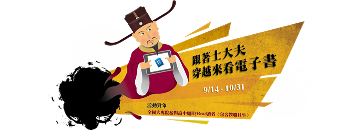 即日起至2018/10/31止,參加「跟著士大夫穿越來看電子書」活動, 借書或推薦或完成任務,就有機會抽各種好獎喔~