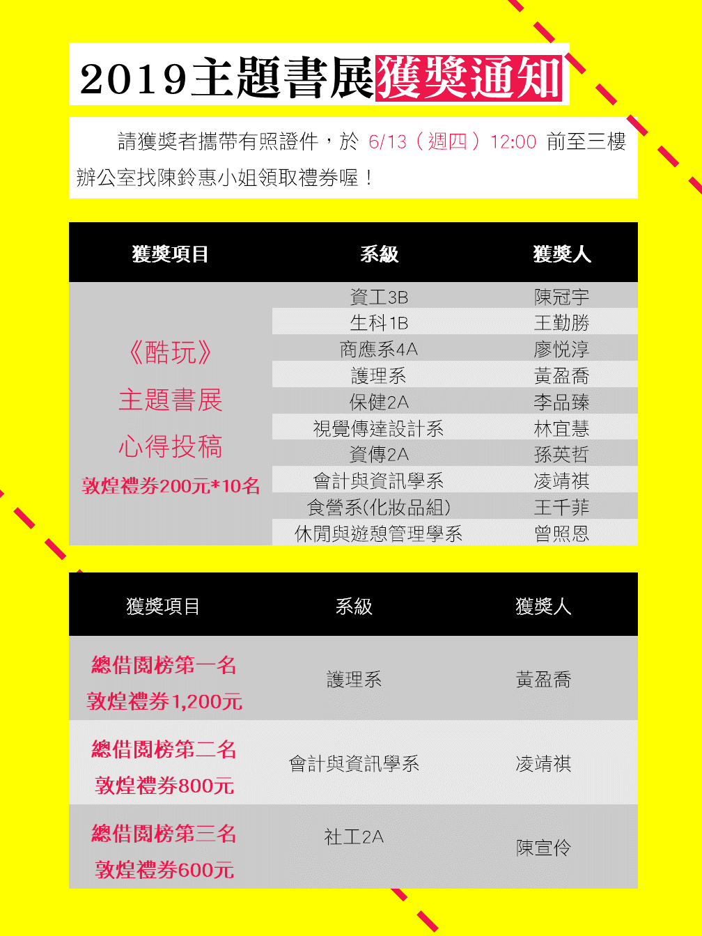 【主題書展】請獲獎者於6/13(四)前來圖書館領取禮券! 2019-06-03 領取日至6/13(週四)12:00截止 請您於08:00-12:00、13:10-17:10之間,攜帶有照證件前往三樓辦公室找陳鈴惠小姐簽領(本屆畢業生可用健保卡或校友證換領)