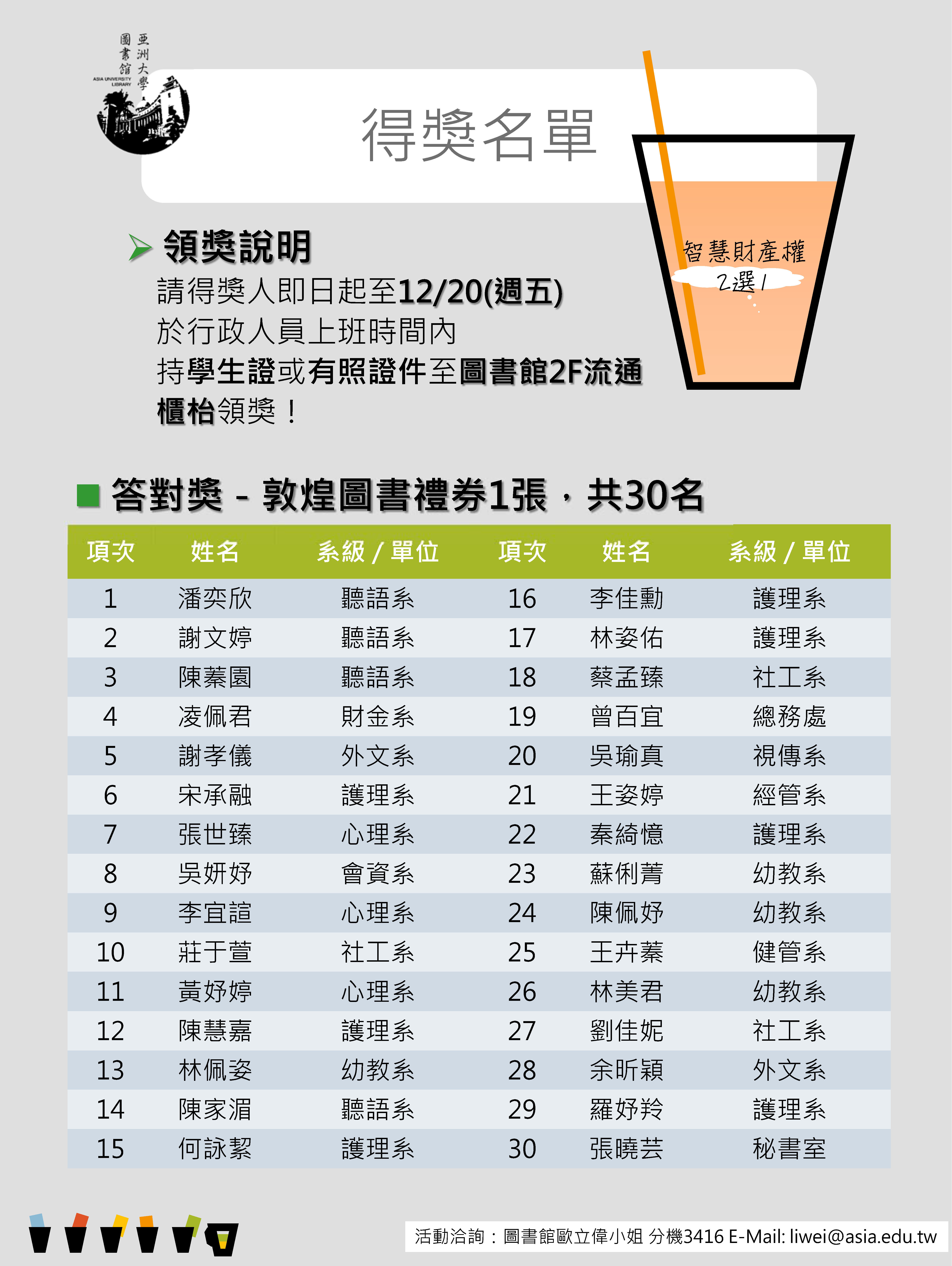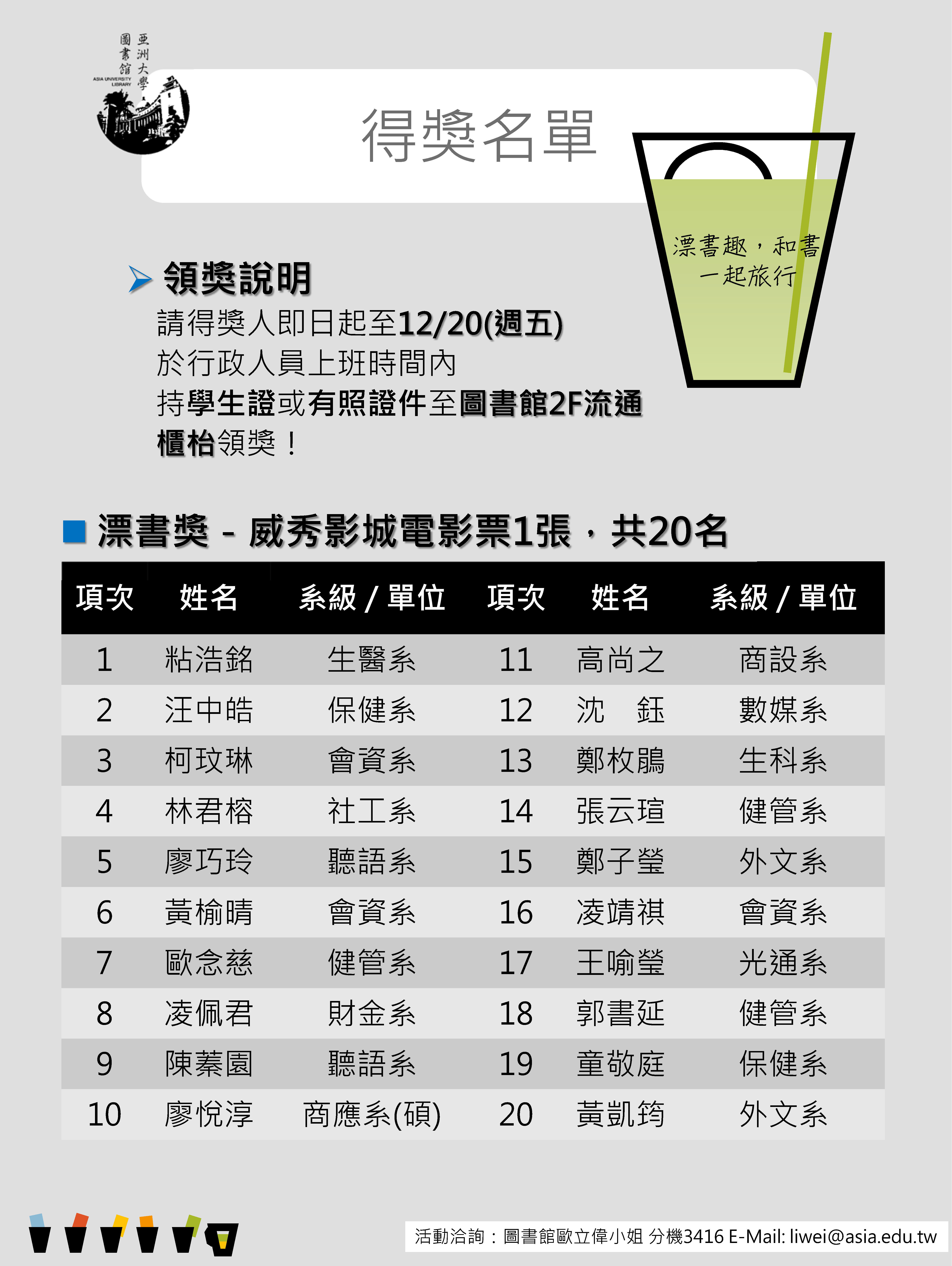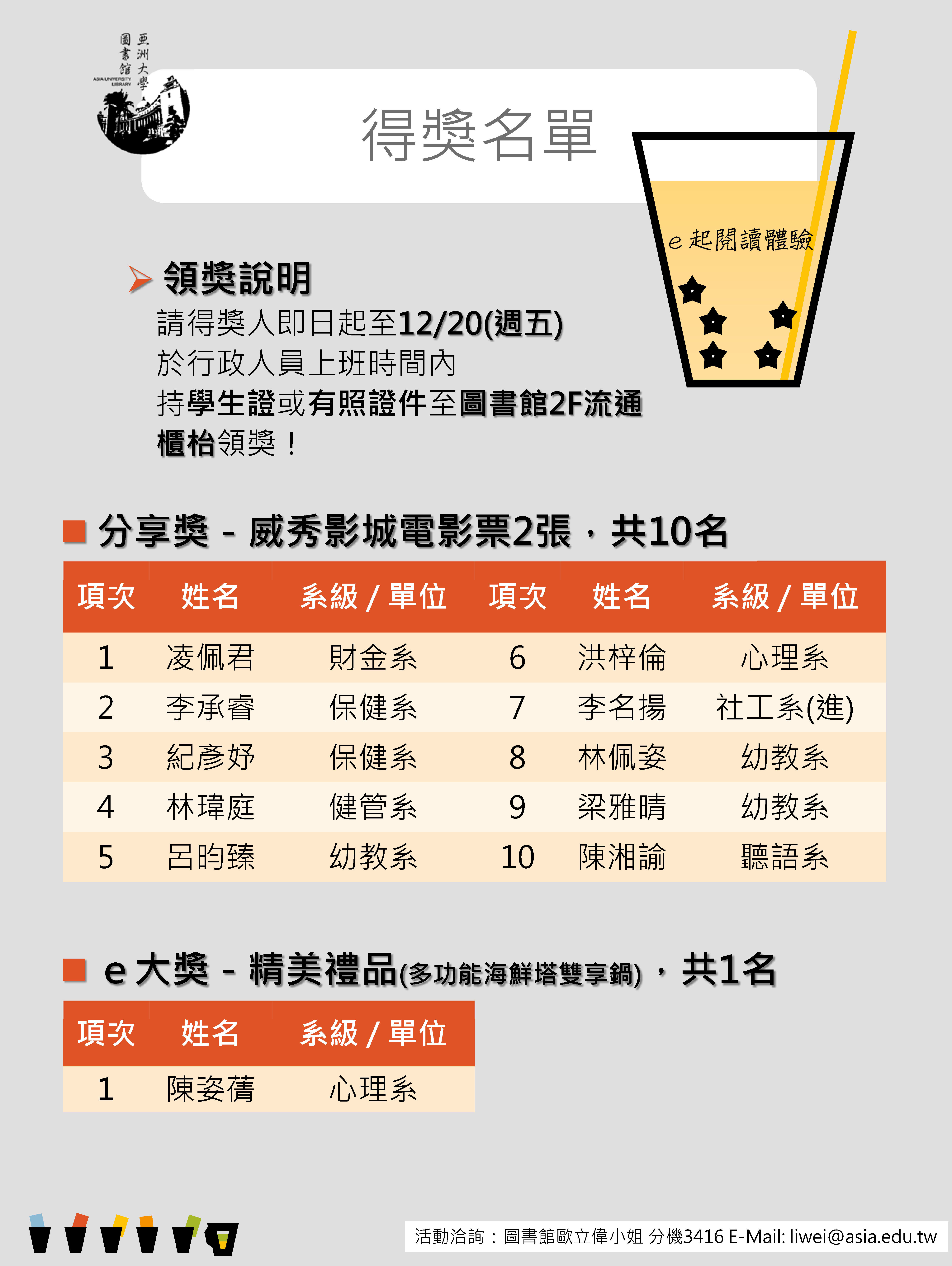 威秀電影票得獎名單 107018056 聽語二A 楊惠伃 104013068 生科四A 黃冠珽 |
