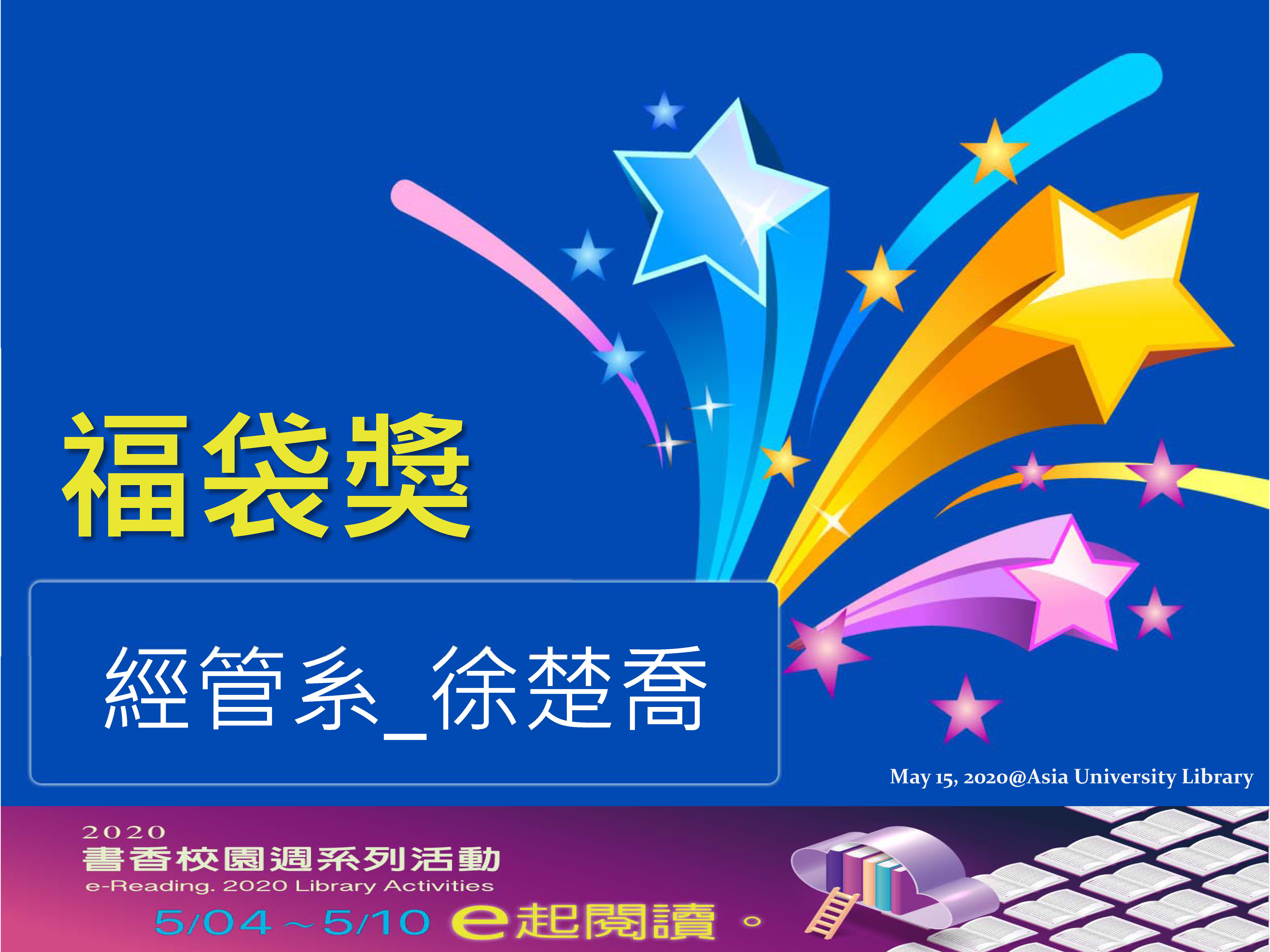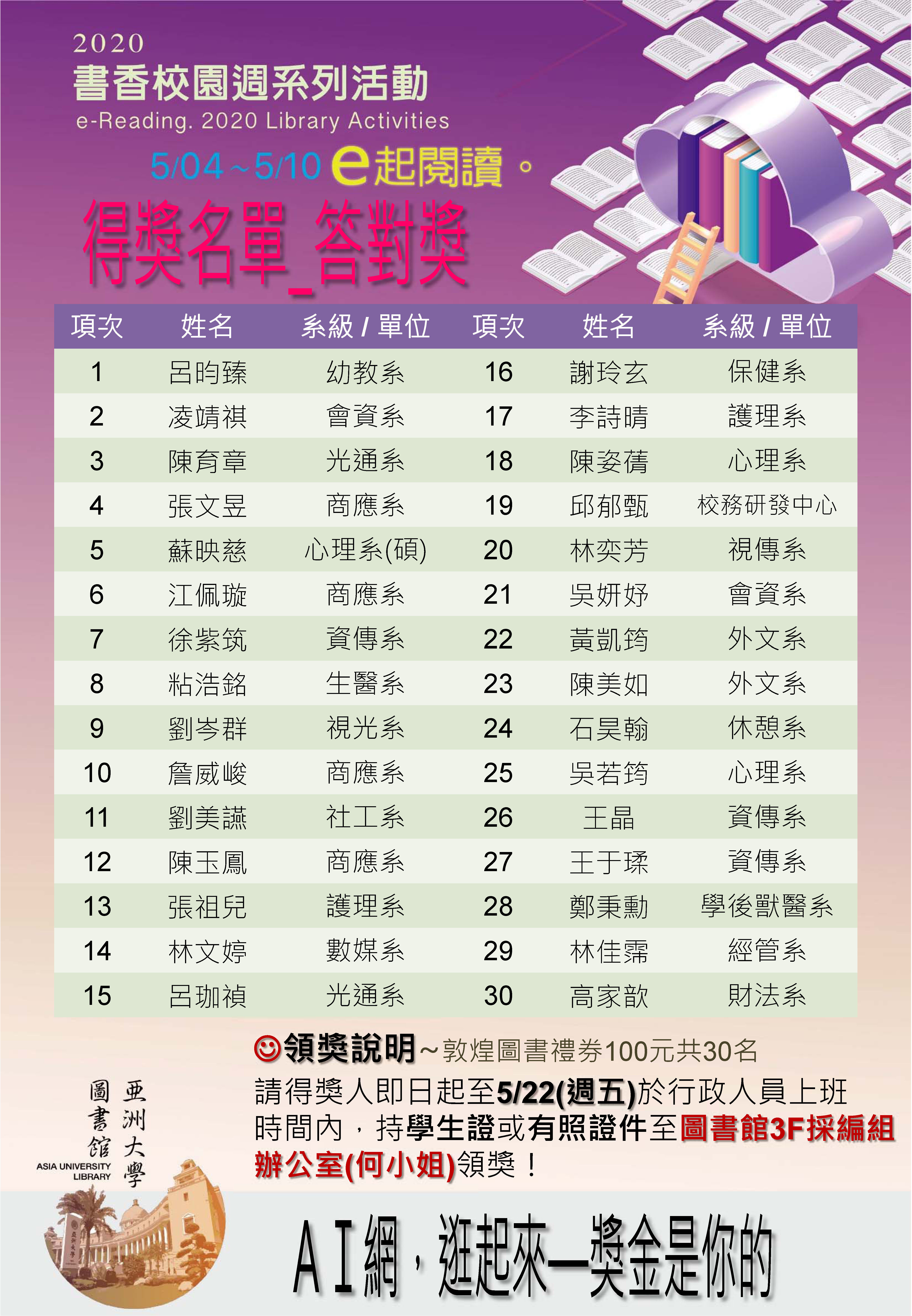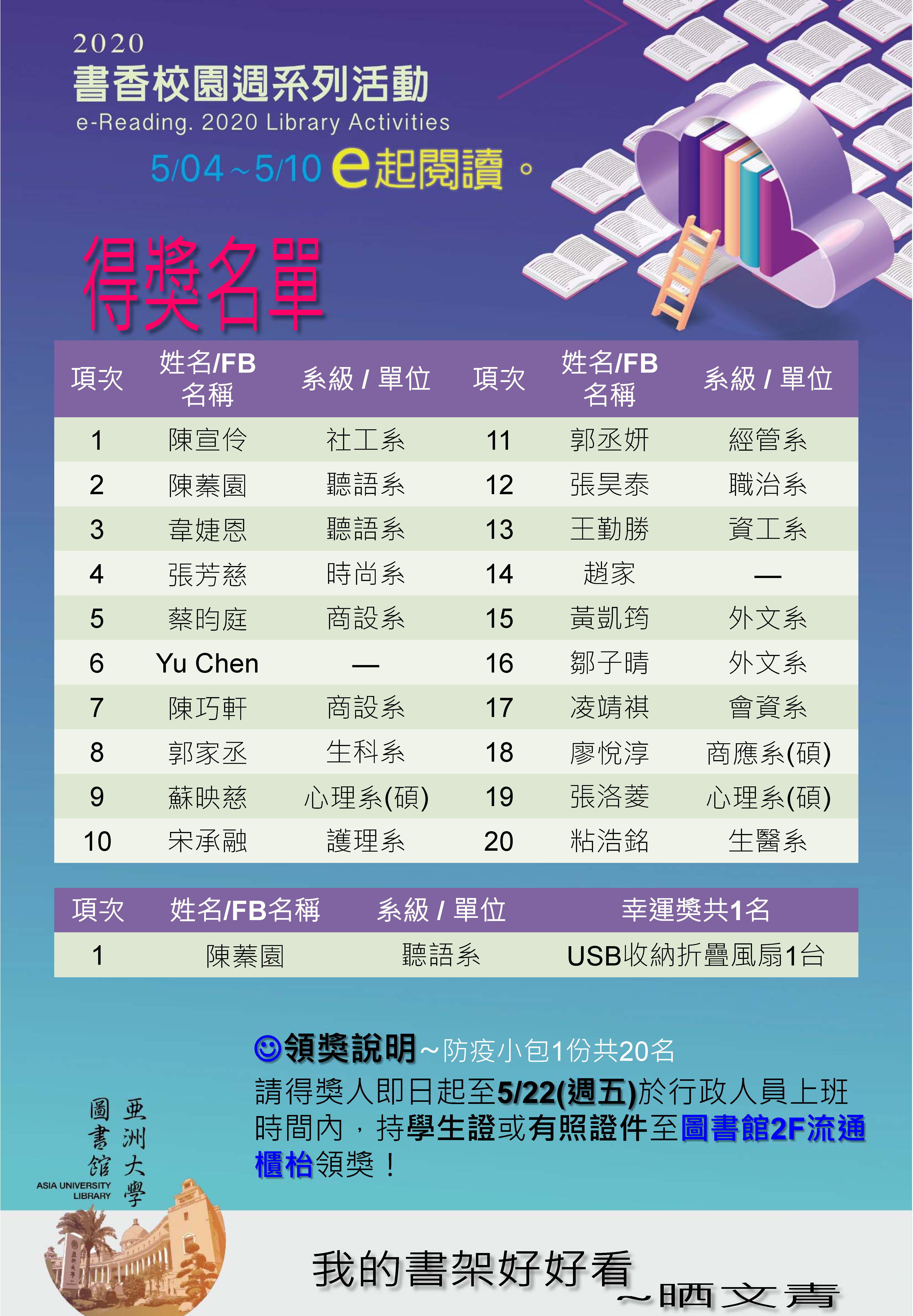 【公告】2020 書香校園週線上活動!得獎名單出爐~名單上的大家,趕快來開心領獎喔! 2020-05-14 領獎時間為2020/5/11-5/22(請於上班時間領獎/中午1200:-13:10為中午休息時間,不開放領獎),領獎地點為圖書館3F採編組辦公室(林小姐)。 提醒您,務必攜帶學生證或者有照片之身分證明文件。 逾期未取視同放棄,圖書館將會通知遞補人選進行領獎。 為避免權益受損,敬請協助於領獎時間內到館領獎!感謝~ 領獎時間為2020/5/11-5/22(請於上班時間8:00-12:00,13:10-17:10領獎/中午12:00-13:10為中午休息時間,不開放領獎),領獎地點為圖書館3F採編組辦公室(何小姐)。 提醒您,務必攜帶學生證或者有照片之身分證明文件。 逾期未取視同放棄,圖書館將會通知遞補人選進行領獎。 為避免權益受損,敬請協助於領獎時間內到館領獎!感謝~