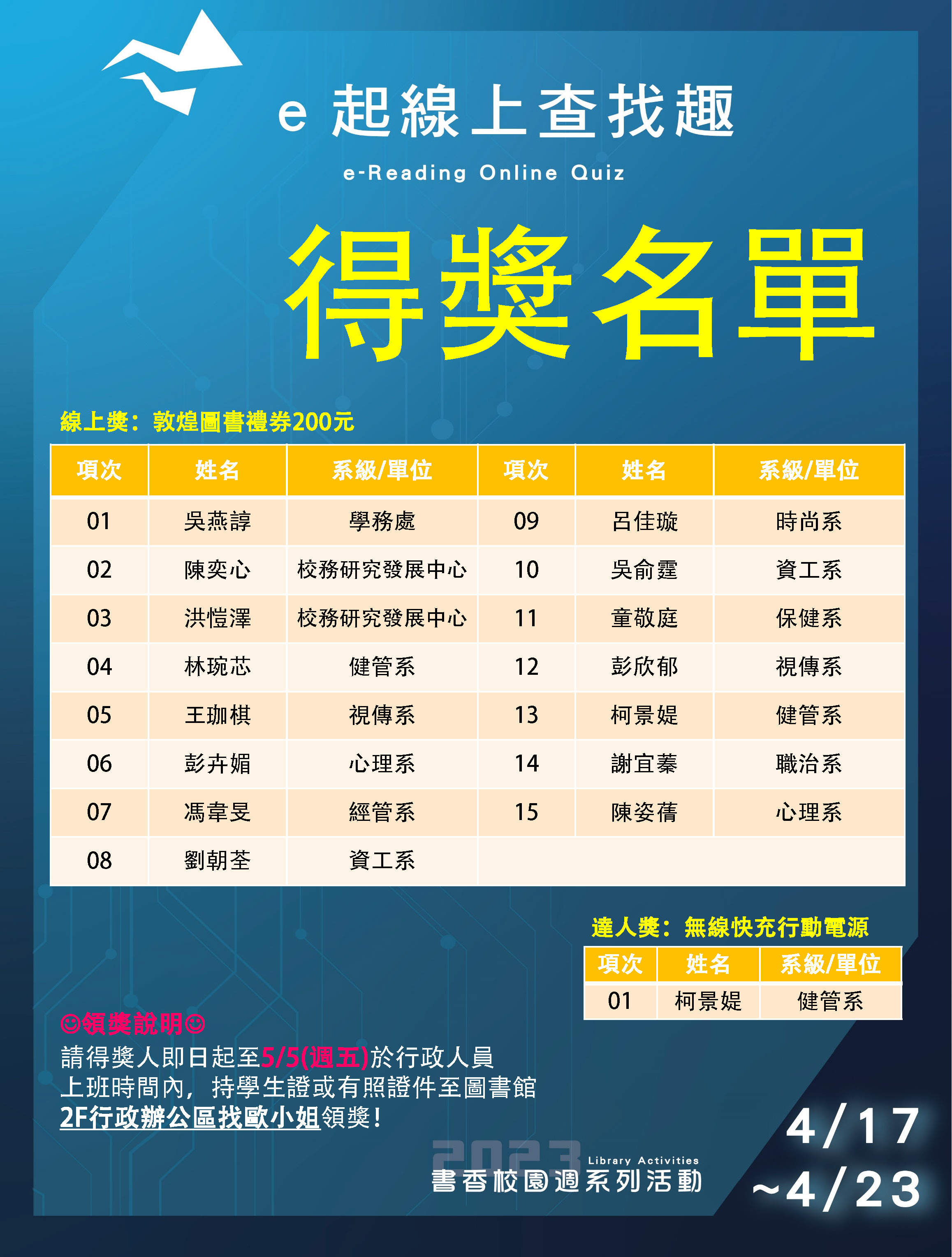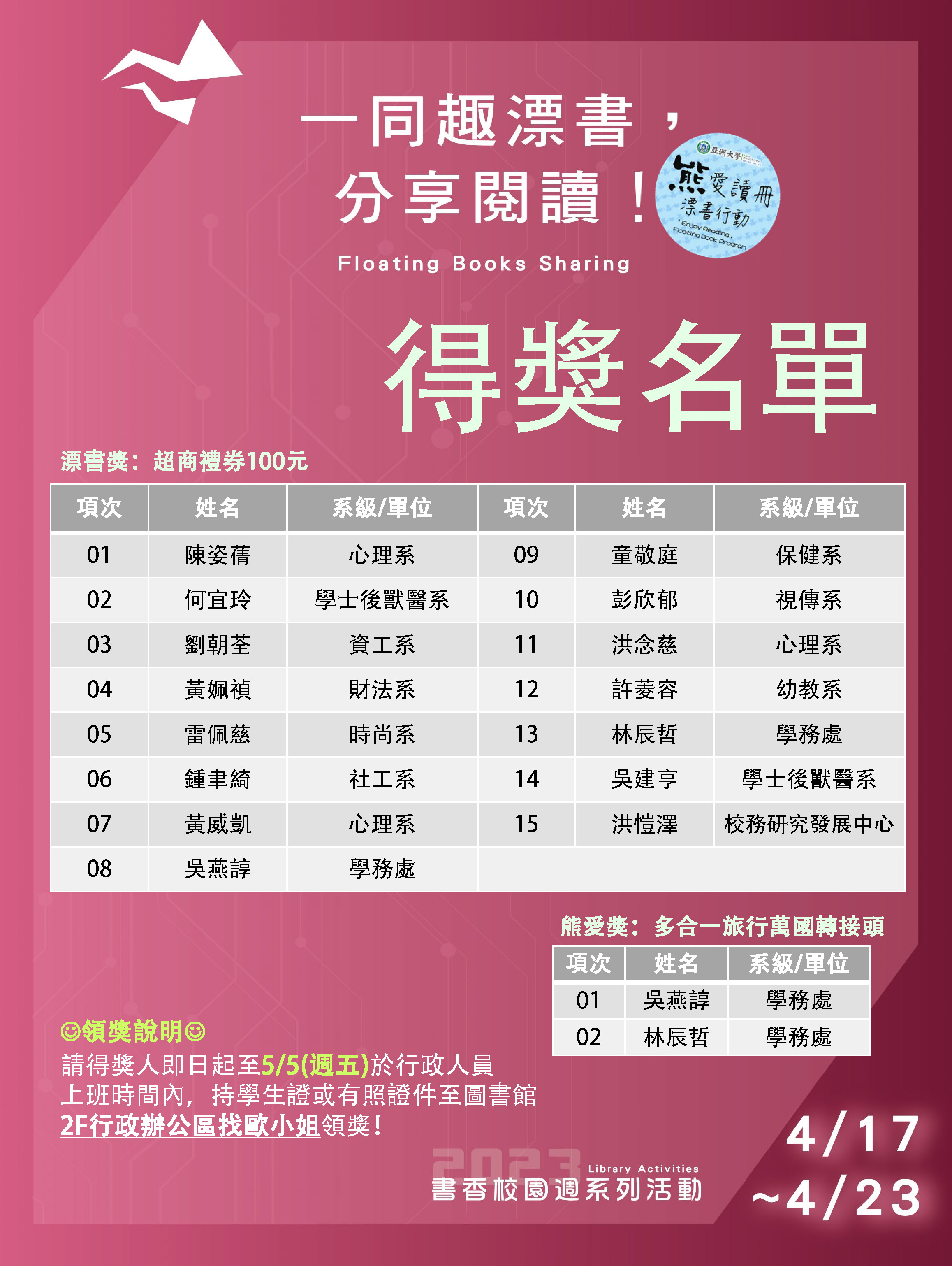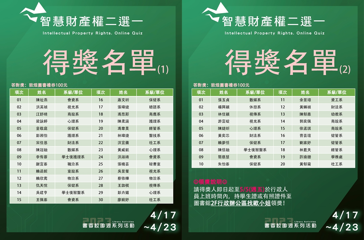 ▲請得獎人即日起至5月5日(五)前,於平日8:00-12:00、13:10-17:00內,持學生證或行動借閱證(圖書館APP)至圖書館3樓行政辦公室 L307找么小姐領獎(分機3417)!