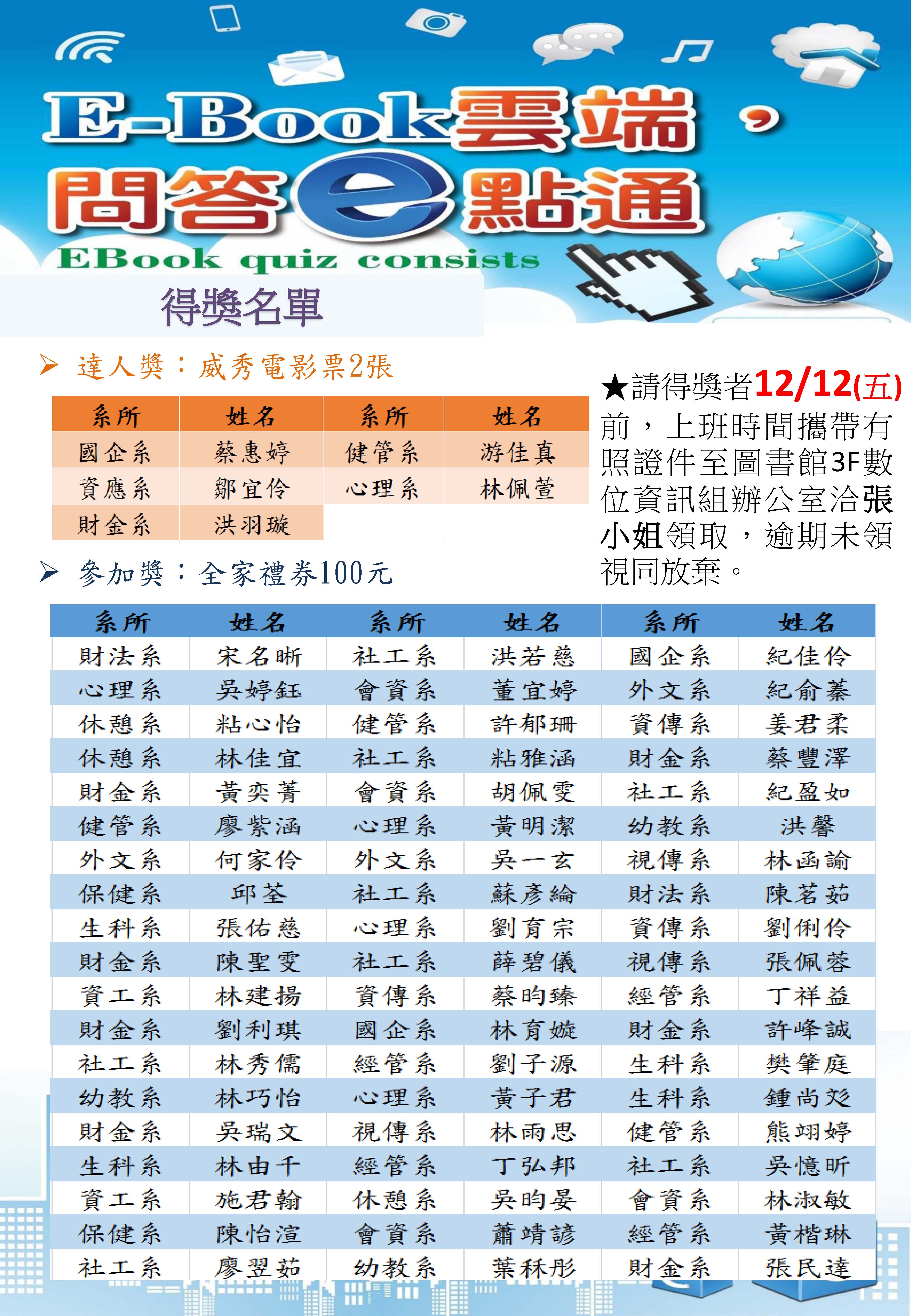 【圖書館週】E-Book雲端,問答e點通,得獎名單公布! 2014-12-09 【E-Book雲端,問答e點通】得獎名單公布!恭喜得獎者,請得獎者於12/12(五)前,上班時間攜帶有照證件至圖書館3F數位資訊組辦公室洽張小姐領取,逾期未領視同放棄。 問題解答