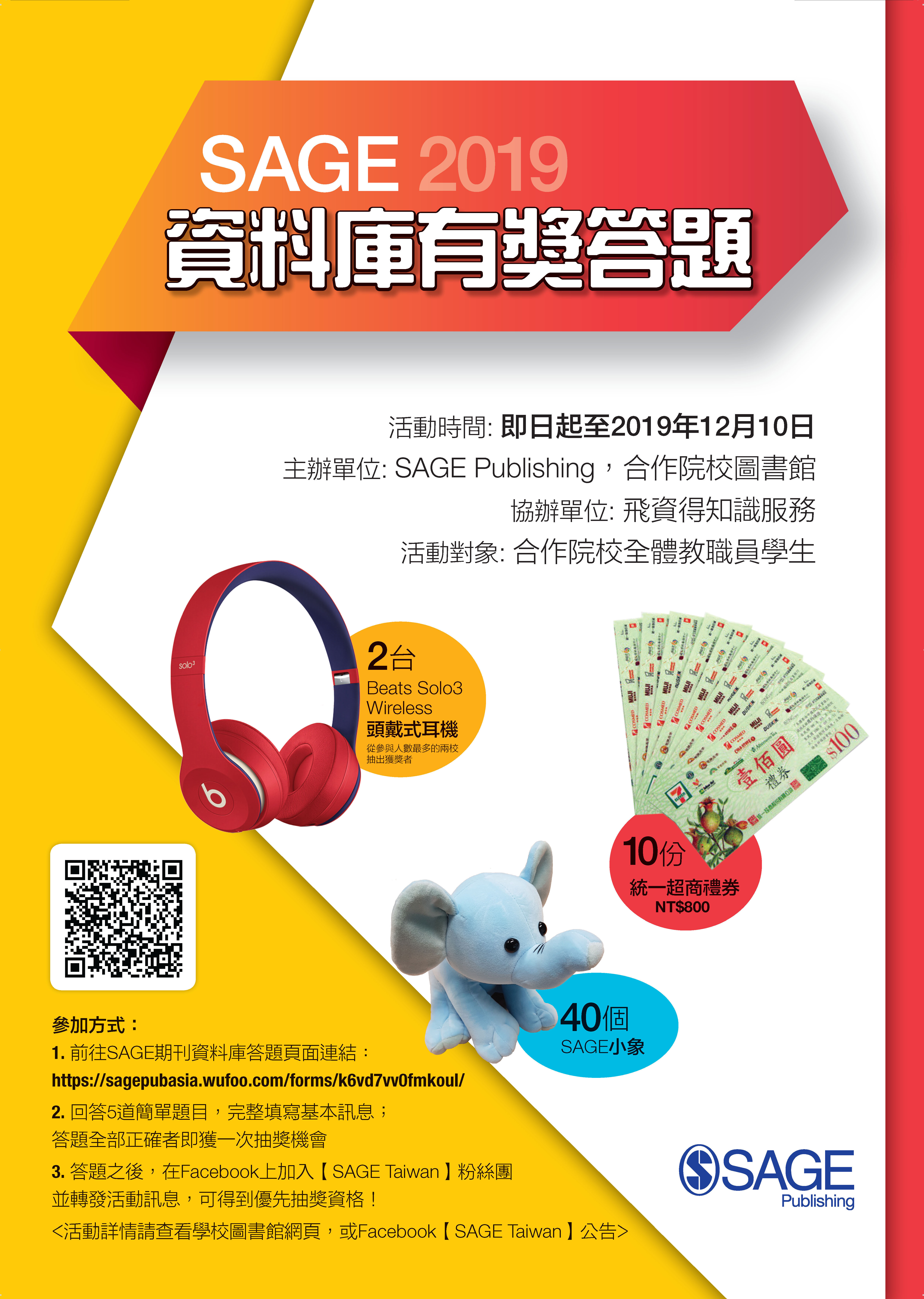 【抽獎】即日起至 2019/12/10止,參加「SAGE 2019資料庫有獎答題」活動,只要答題全部正確者即可參加抽獎,頭戴式耳機或7-11禮券帶回家喔!