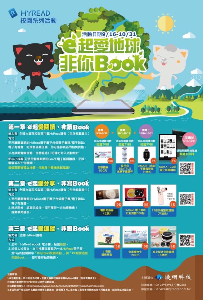 【抽獎】即日起至2019/10/31止,參加「e起愛地球,非你Book」HyRead電子書校園活動,有機會抽中多項好禮喔! 2019-09-23 即日起至2019/10/31止,參加「e起愛地球,非你Book」HyRead電子書校園活動,有機會抽中多項好禮喔!