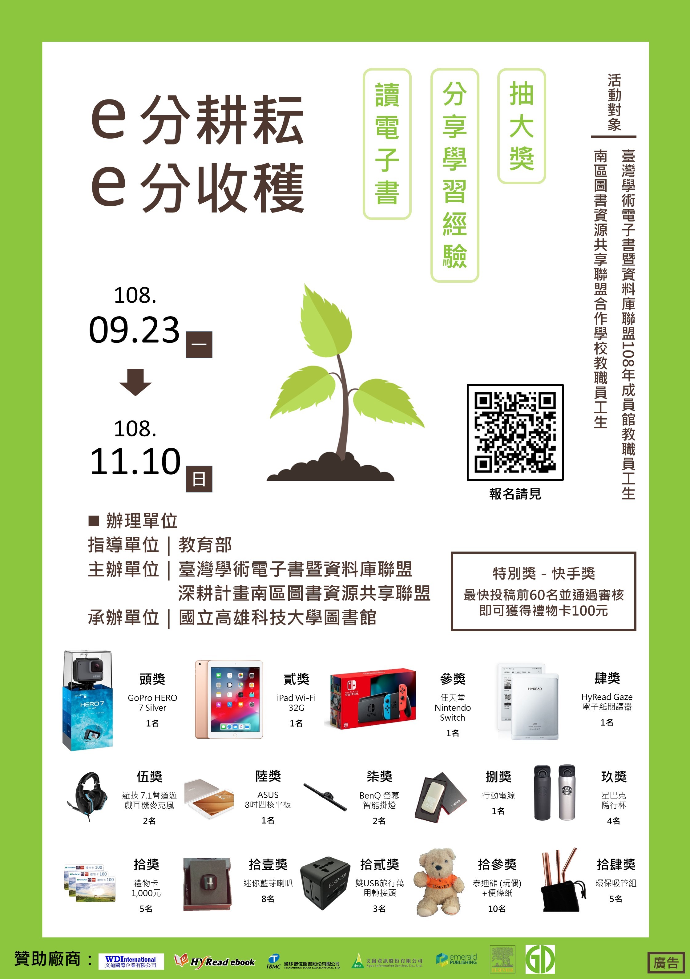 【抽獎】即日起至2019/11/10止,參加「e分耕耘.e分收穫」電子書活動, 讀電子書、分享學習經驗、抽大獎! 2019-09-26 即日起至2019/11/10止,參加「e分耕耘.e分收穫」電子書活動,讀電子書、分享學習經驗、抽大獎!