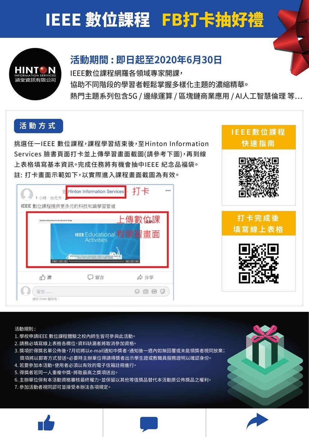 挑選任一IEEE 數位課程,課程學習結束後,打卡 Hinton Information Services 臉書頁面並上傳學習畫面截圖,