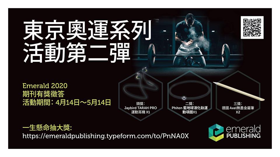 【抽獎】東京奧運系列活動第二彈!2020/4/14~5/14止,參加「Emerald 2020 期刊有獎徵答」活動,有機會抽大獎喔! 2020-04-13 【抽獎】東京奧運系列活動第二彈!2020/4/14~5/14止,參加「Emerald 2020 期刊有獎徵答」活動,有機會抽大獎喔!