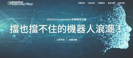 「擋也擋不住的機器人浪潮」2018 Ei Compendex有獎徵答活動,一起挑戰拿大獎! 2018-04-26 即日起至2018/5/9止,參加「擋也擋不住的機器人浪潮」2018 Ei Compendex有獎徵答活動, 一起探究AI科技的同時,資料完整且答題正確者,就有機會抽中空拍機等大獎喔!