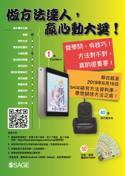 【有獎徵答】做方法達人,贏心動大獎!即日起至 2019/6/16止,參加2019 SAGE研究方法資料庫有獎答題活動,答題全部正確者即可參加抽獎,iPad Mini 4或7-11禮券帶回家喔! 2019-05-01