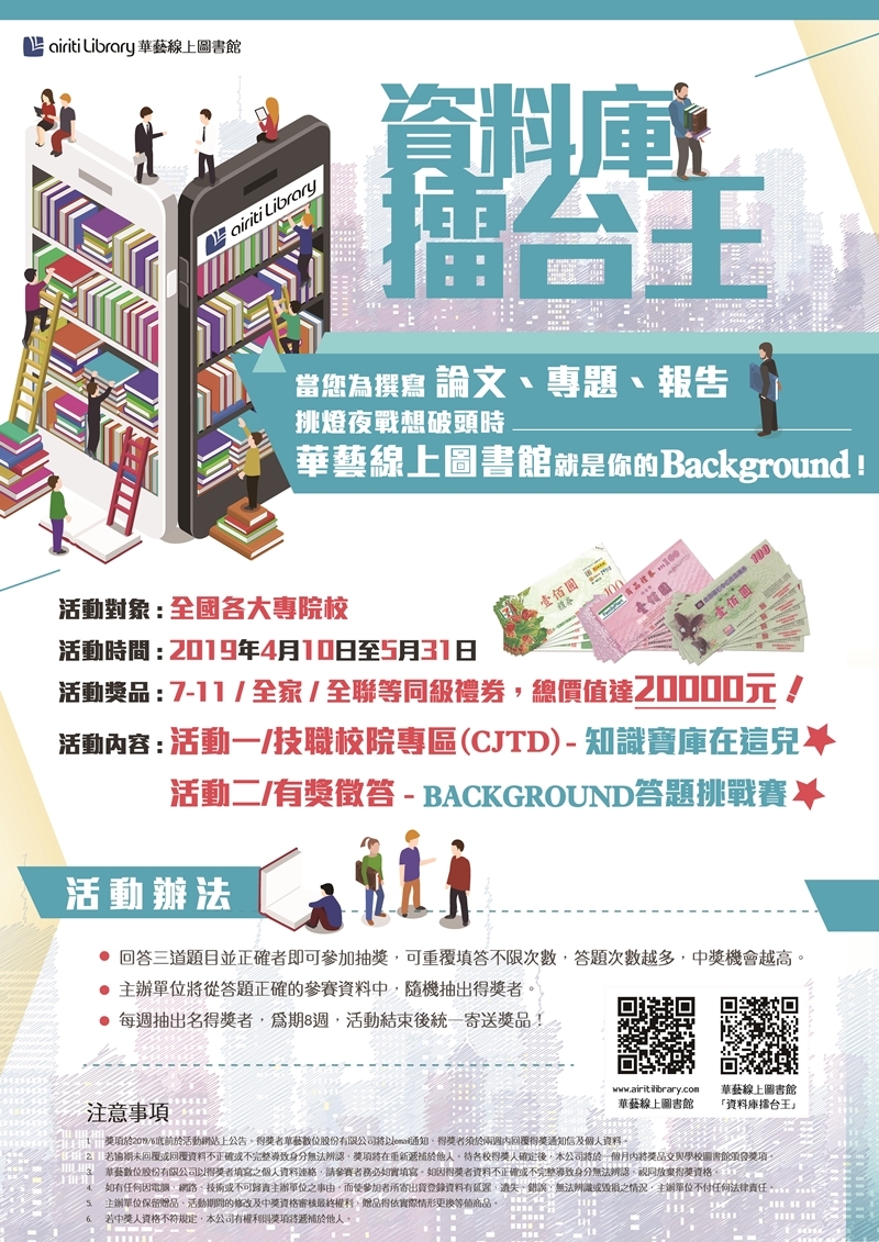 【有獎徵答】即日起至2019/5/31止,參加2019年 華藝線上圖書館「資料庫擂台王」有獎徵答活動,有機會抽7-11/全家/全聯等同級各面額禮券。不限次數填答,答越多、中獎機會越高! 2019-04-11