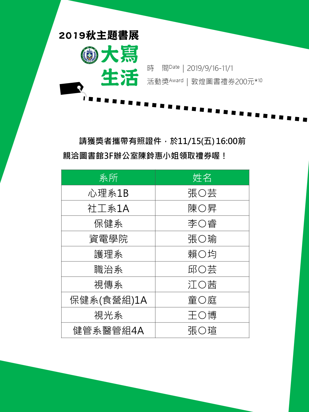【活動】主題書展《大寫生活》心得投稿抽獎10名出爐囉!請於11/15(五)17:00前親洽圖書館陳鈴惠小姐領獎喔!