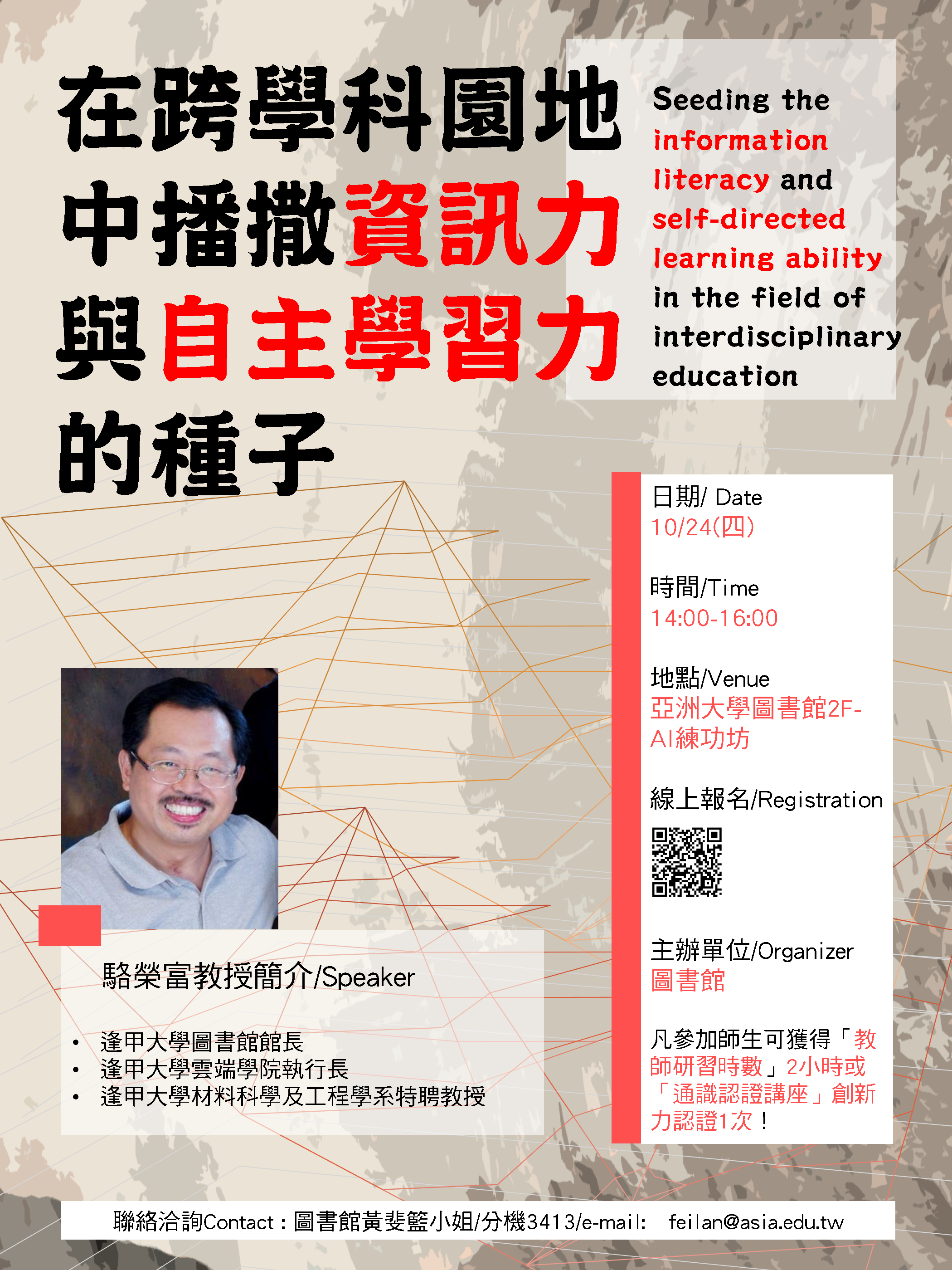 【活動】歡迎報名!10/24(四)14:00-16:00本館AI練功坊,駱榮富教授《在跨學科園地中播撒資訊力與自主學習力的種子》專題演講