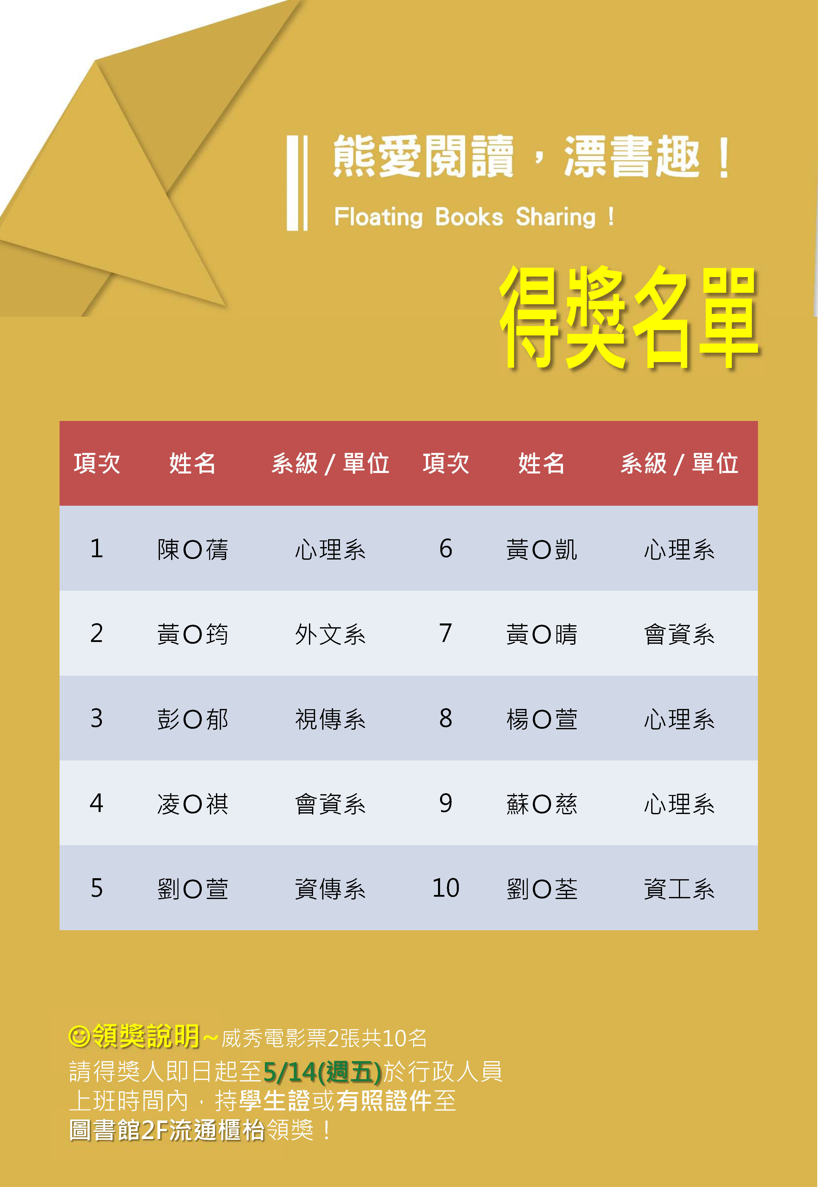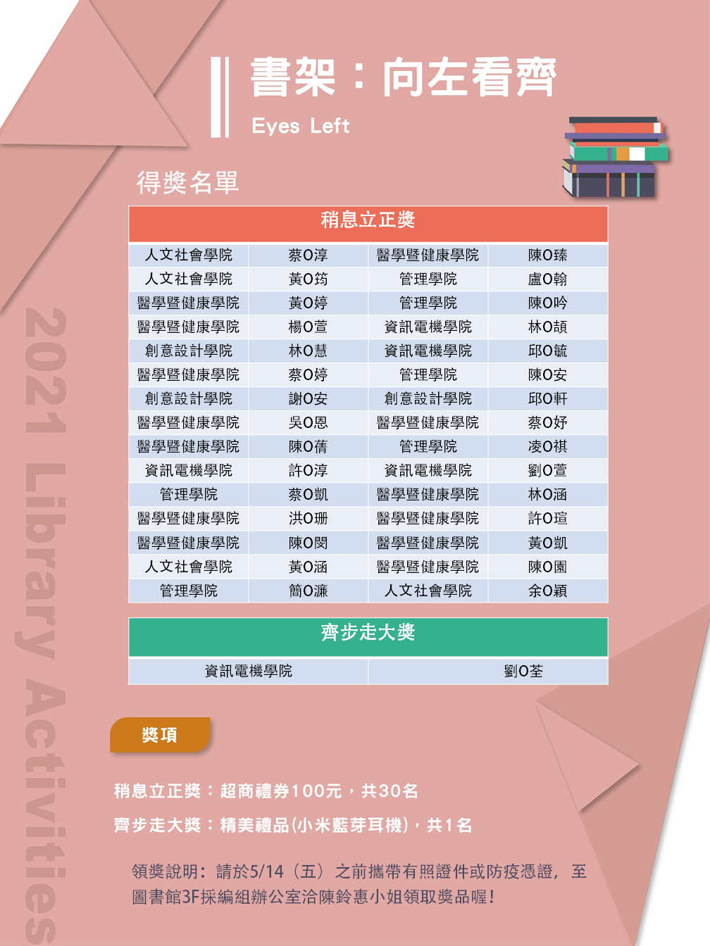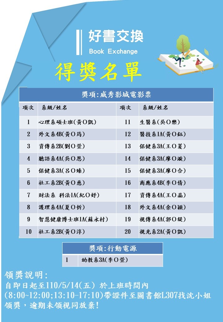 【活動】109-2書香週活動得獎公告! 2021-05-06 領取說明 請於上班時間08:00~12:00、13:10~17:10之間領取 (12:00~13:10為中午休息時間,不開放領獎) 逾期未取視同放棄,圖書館將通知遞補人選進行領獎