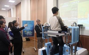 圖說:蔡進發校長與師生到AI智慧醫療體驗區參觀,校方人員模擬行走障礙患者利用「下肢肌力訓練機」步行訓練。