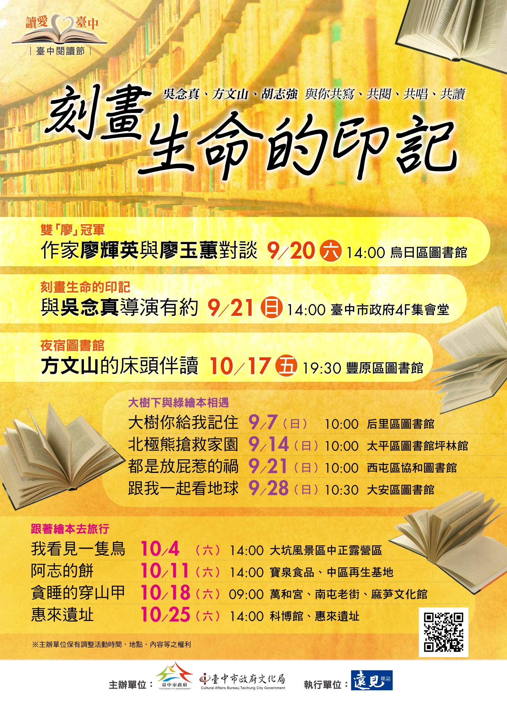 為了發揮臺中市長期累積的閱讀及文學活動能量,遠見雜誌與臺中市政府文化局共同舉辦「讀愛臺中.臺中閱讀節」系列活動,透過針對不同年齡層、族群、區域等的活動規劃,邀請名人分享己身的經驗,期待能點燃閱讀的熱情,發揮更深層的啟發,深化閱讀思考力。歡迎踴躍報名參加。