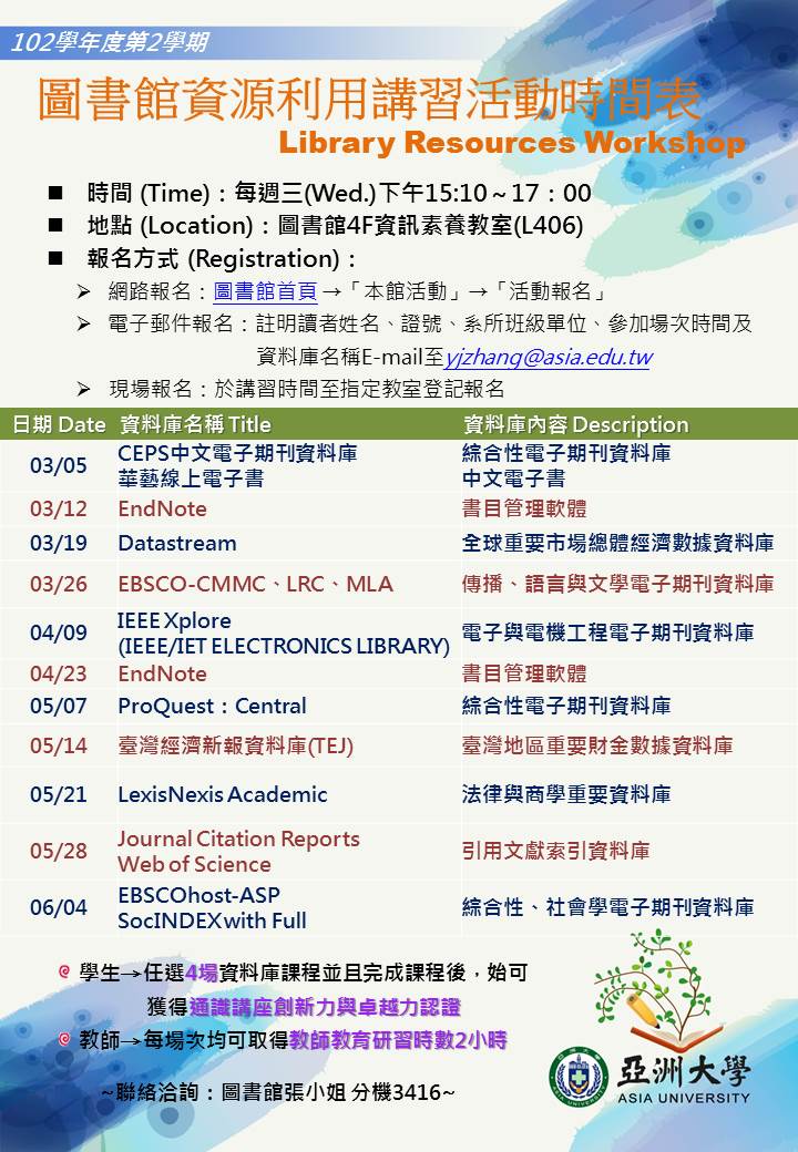 包含EndNote、CEPS中文電子期刊資料庫等多種資料庫及電子書使用教學,每週三下午15:10-17:00於圖書館4F資訊素養教室進行,歡迎全校師生踴躍報名參加,還有機會獲得通識講座認證或教師研習時數!