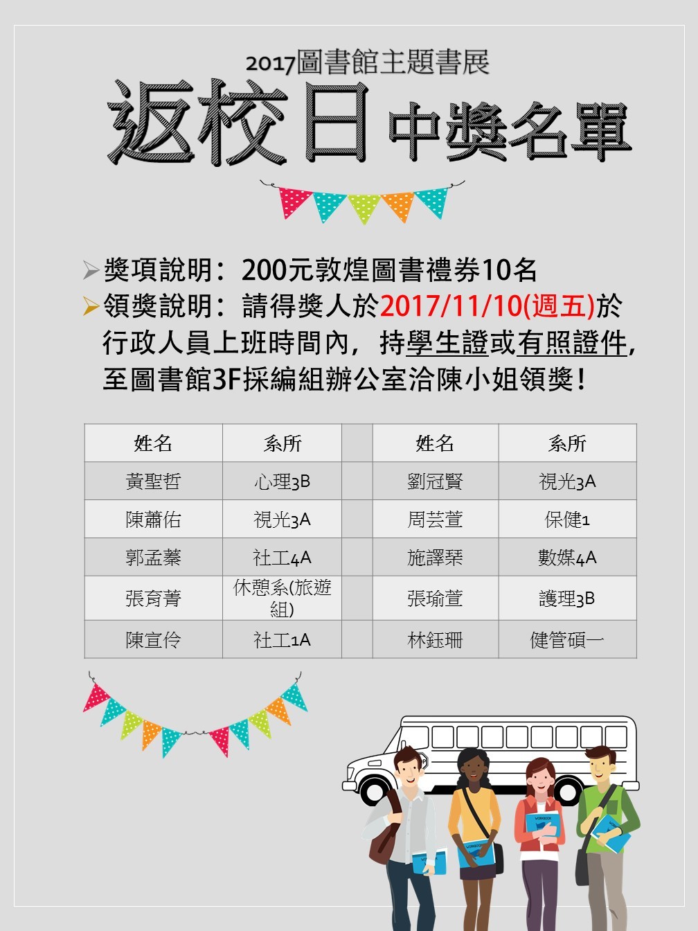 106-1第1主題書展【返校日】-賀10名同學得獎!請於2017/11/10(五)17:10前至採編辦公室找陳小姐領獎!