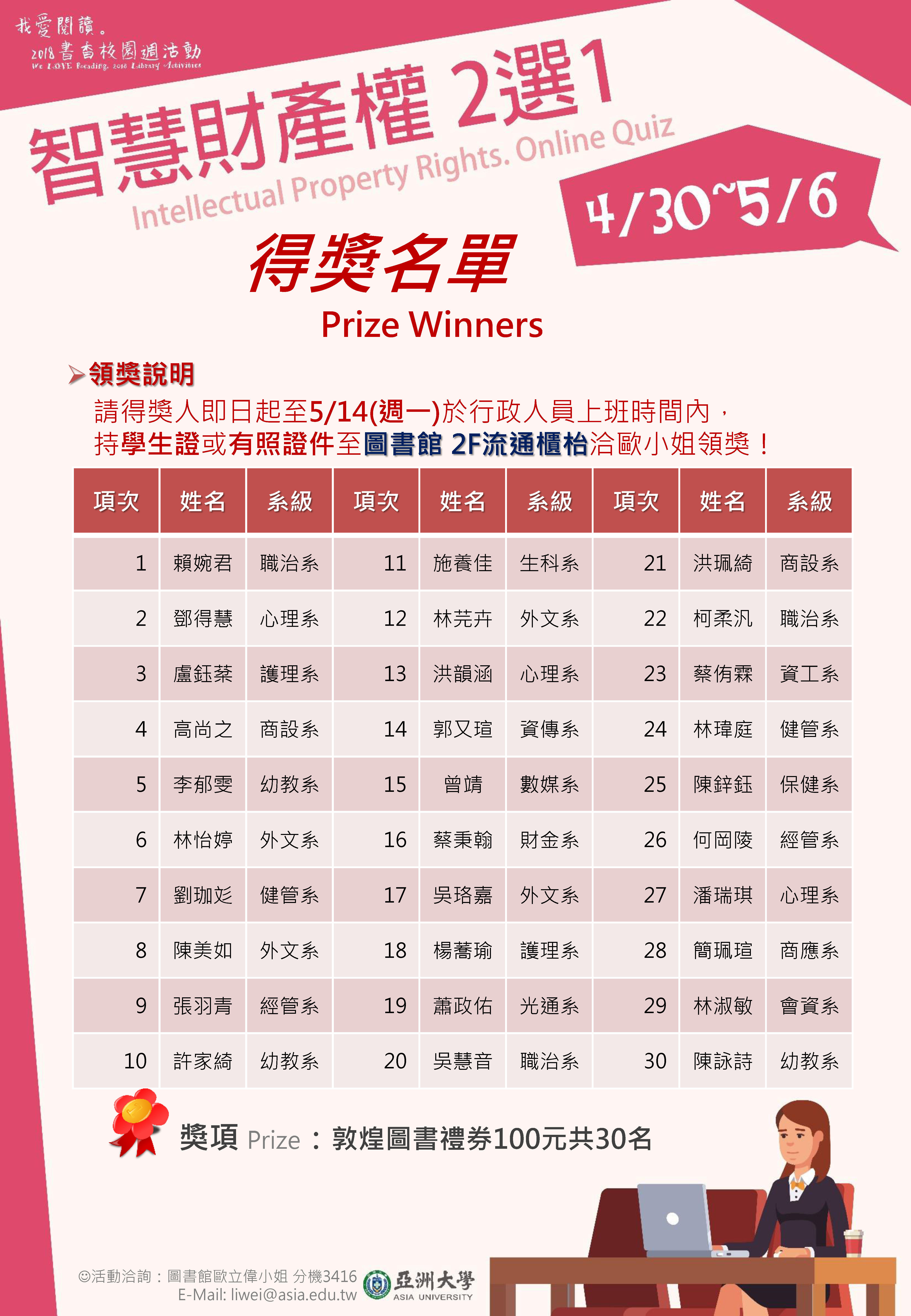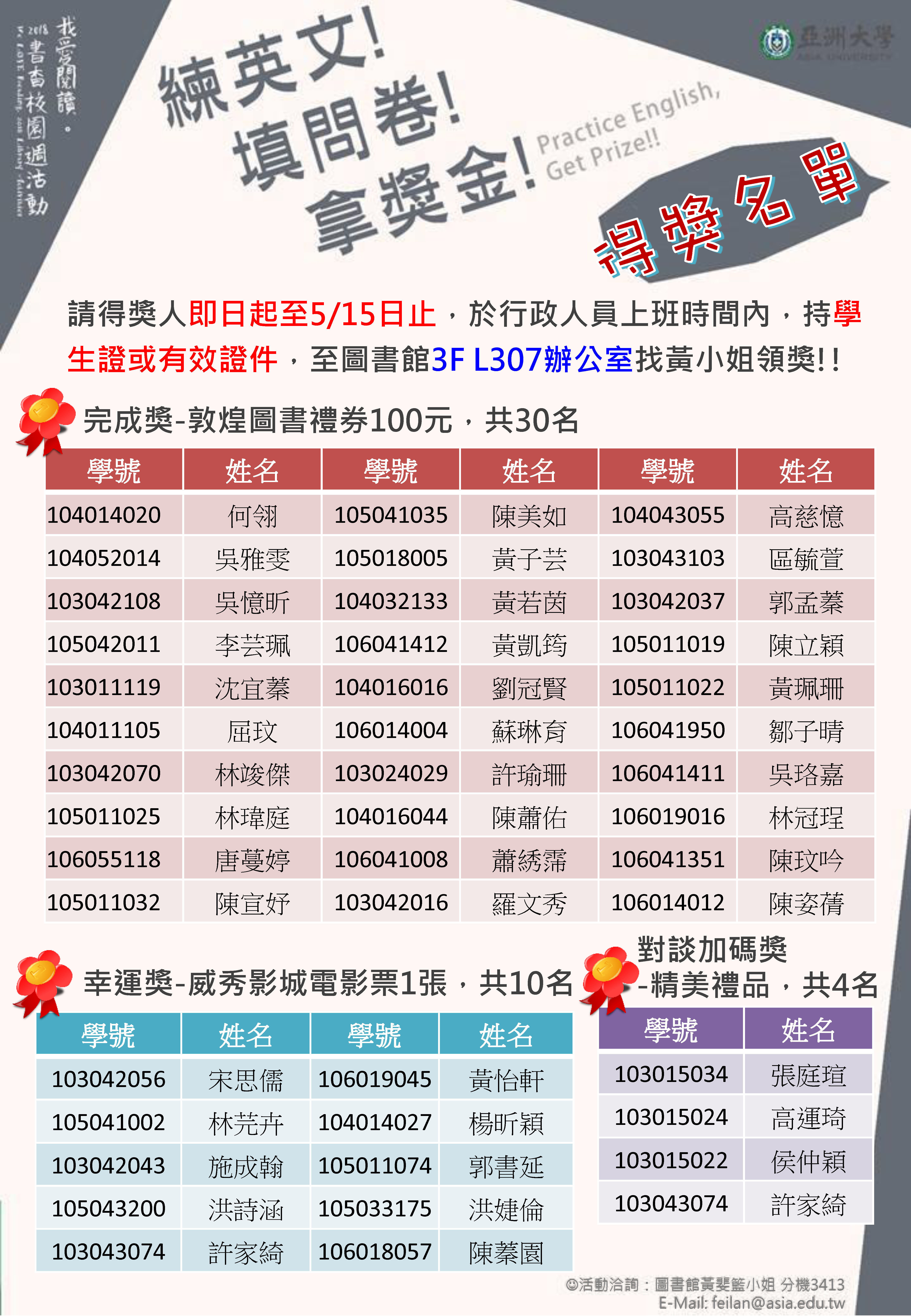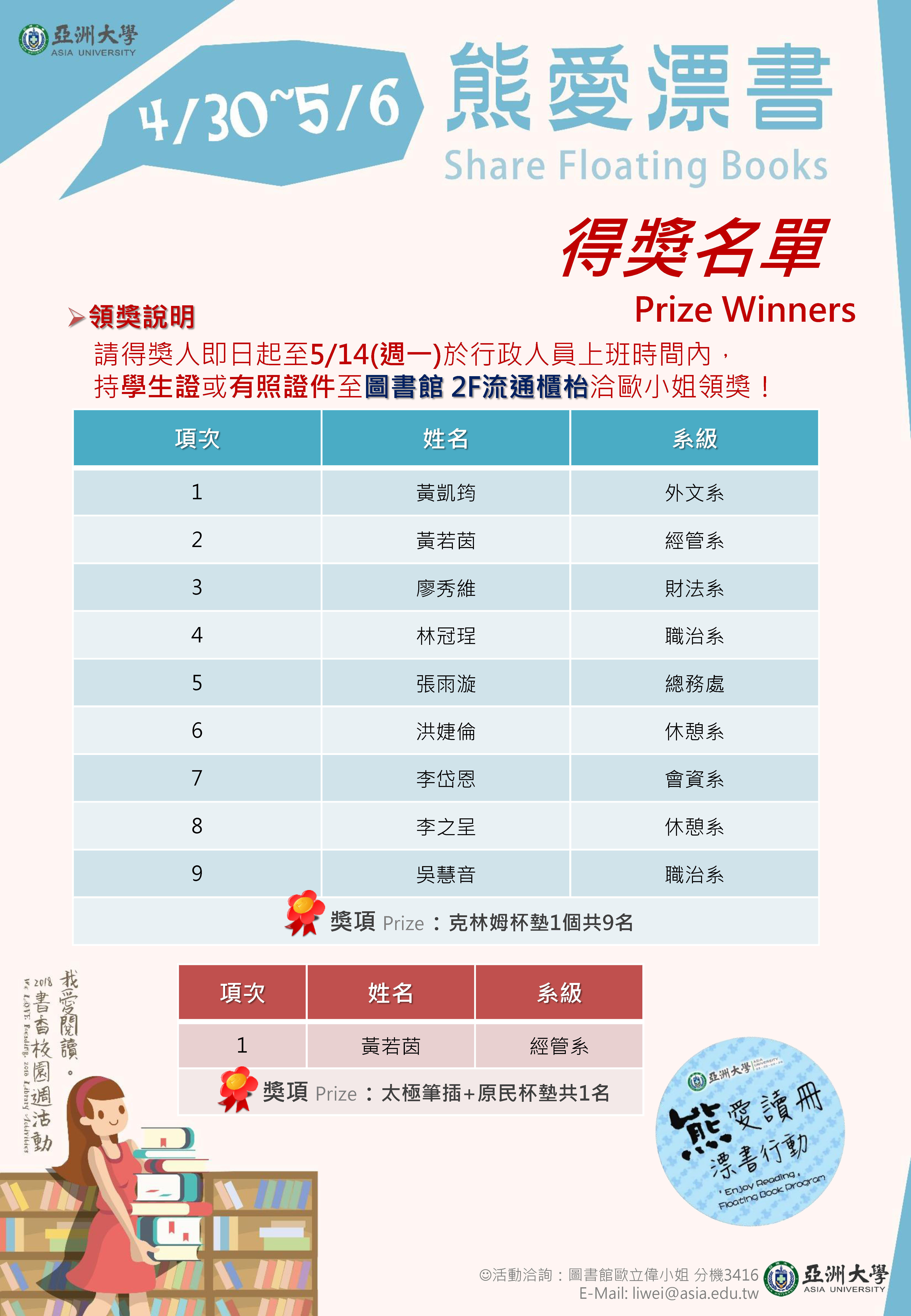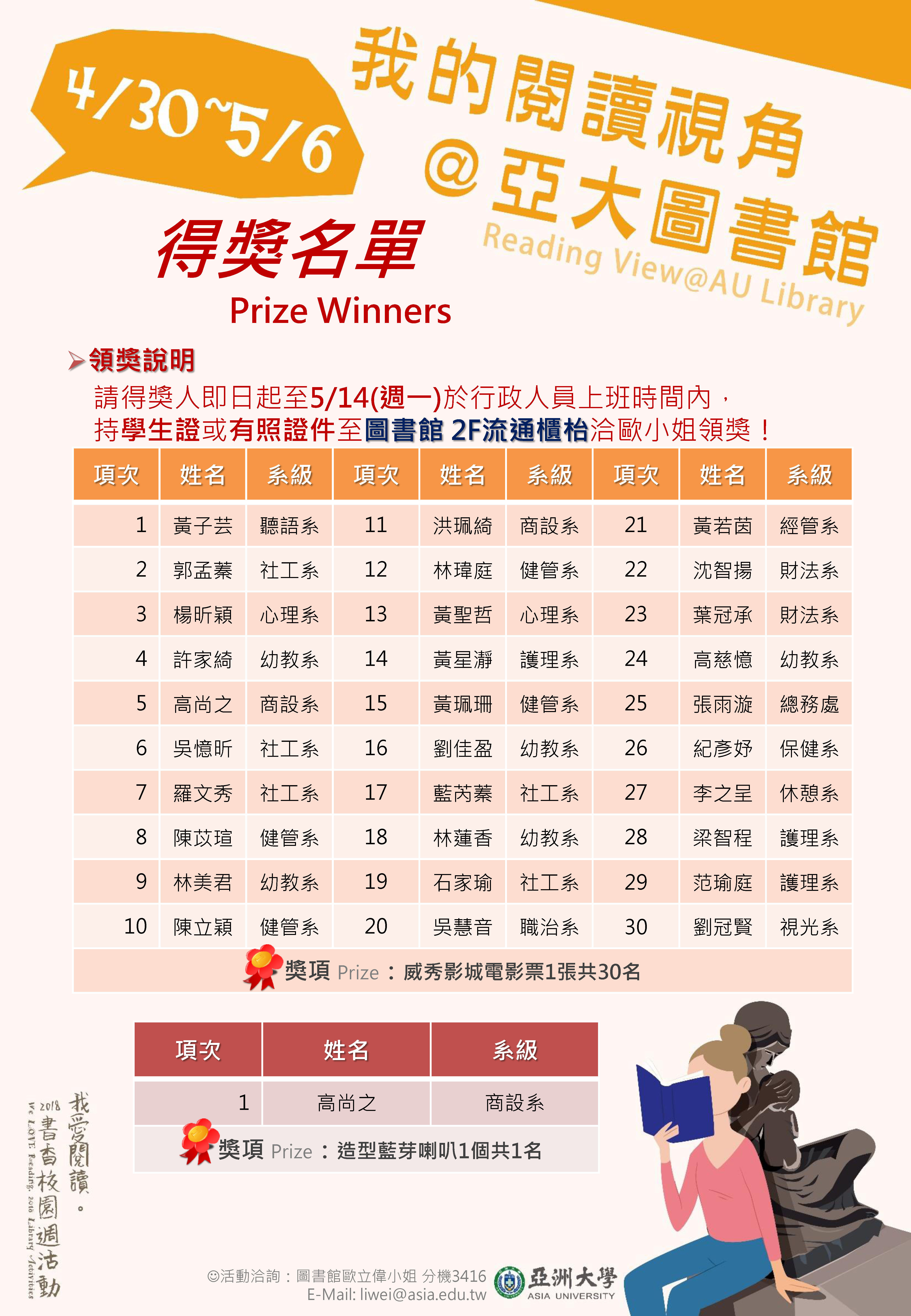 2018書香校園週系列活動得獎名單出爐~名單上的大家,趕快來開心領獎喔!