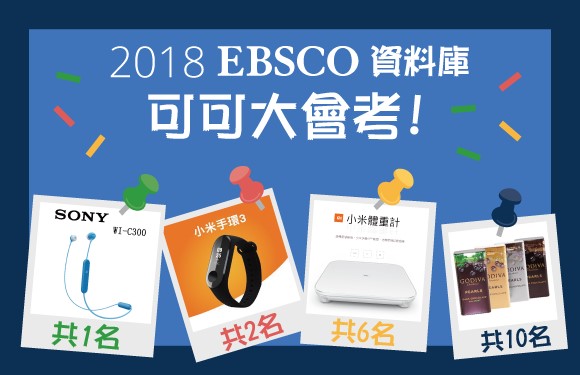 2018 EBSCO「可可大會考」線上有獎徵答活動,趕快來參加! 2018-10-02 即日起至2018/11/10止,參加「可可大會考」系列活動,只要直接連線至 EBSCO資料庫,並搜尋資料庫的內容寄送文章,就有機會獲得好獎!